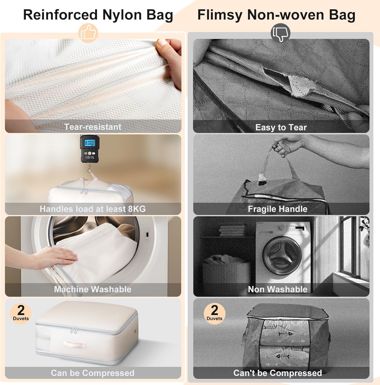 - [Washable & Tear-Resistant for Long-Lasting Use] Unlike non-woven bags and ordinary compression quilt bagsļ¼ crafted from tear-resistant nylon fabric, our compression bags for storage are washable, odor-free, and slightly water-resistant. These features ensure that your bedding storage remains safe from dust, moisture, and wear, making it the ideal choice for protecting your household items long-term.