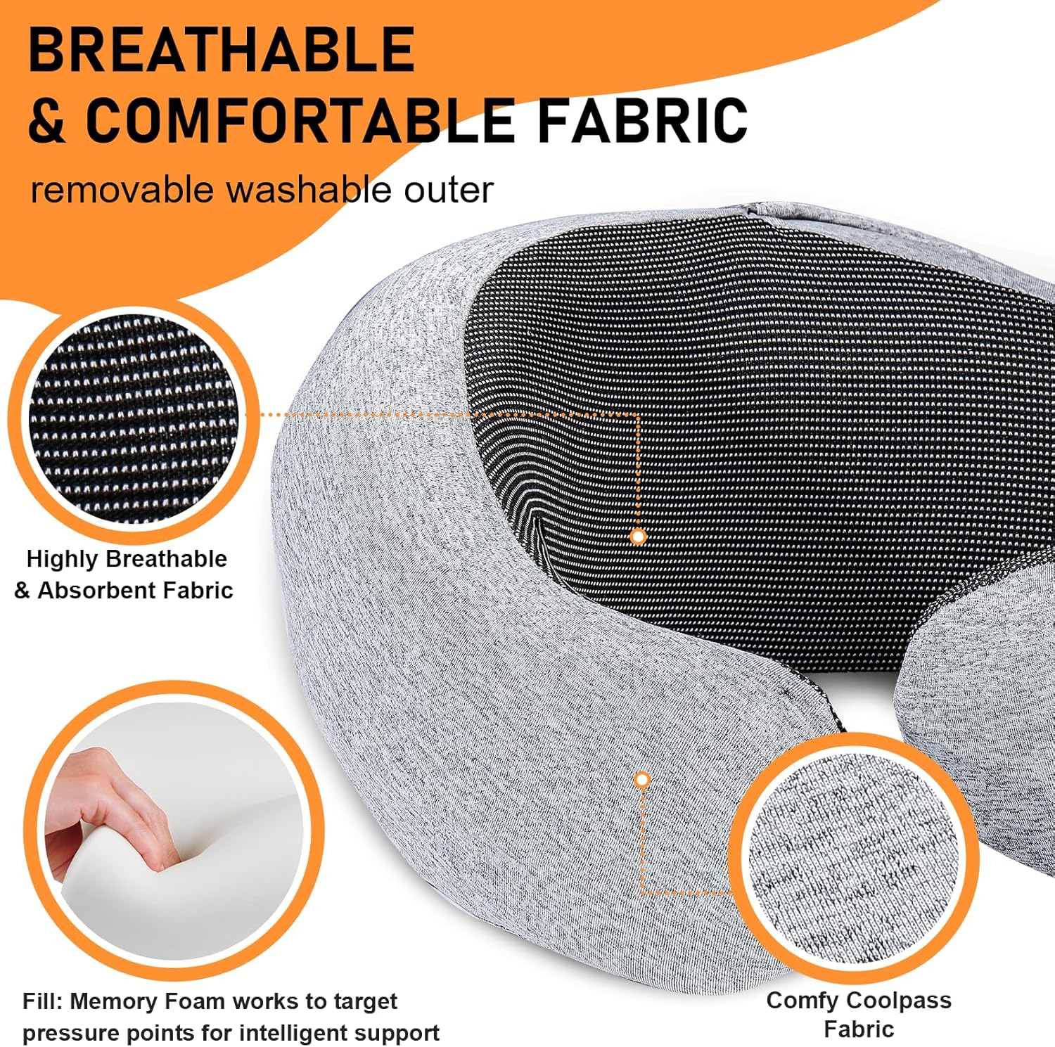 - COMY BREATHABLE FABRIC - Our airplane pillow's outer layer is constructed with a soft stretchy cool pass fabric that allows air to pass through the neck pillow. the inner moisture-absorbing fabric keeps your neck dry and comfy. the outer layer is removable and machine washable, making cleaning quick and easy.