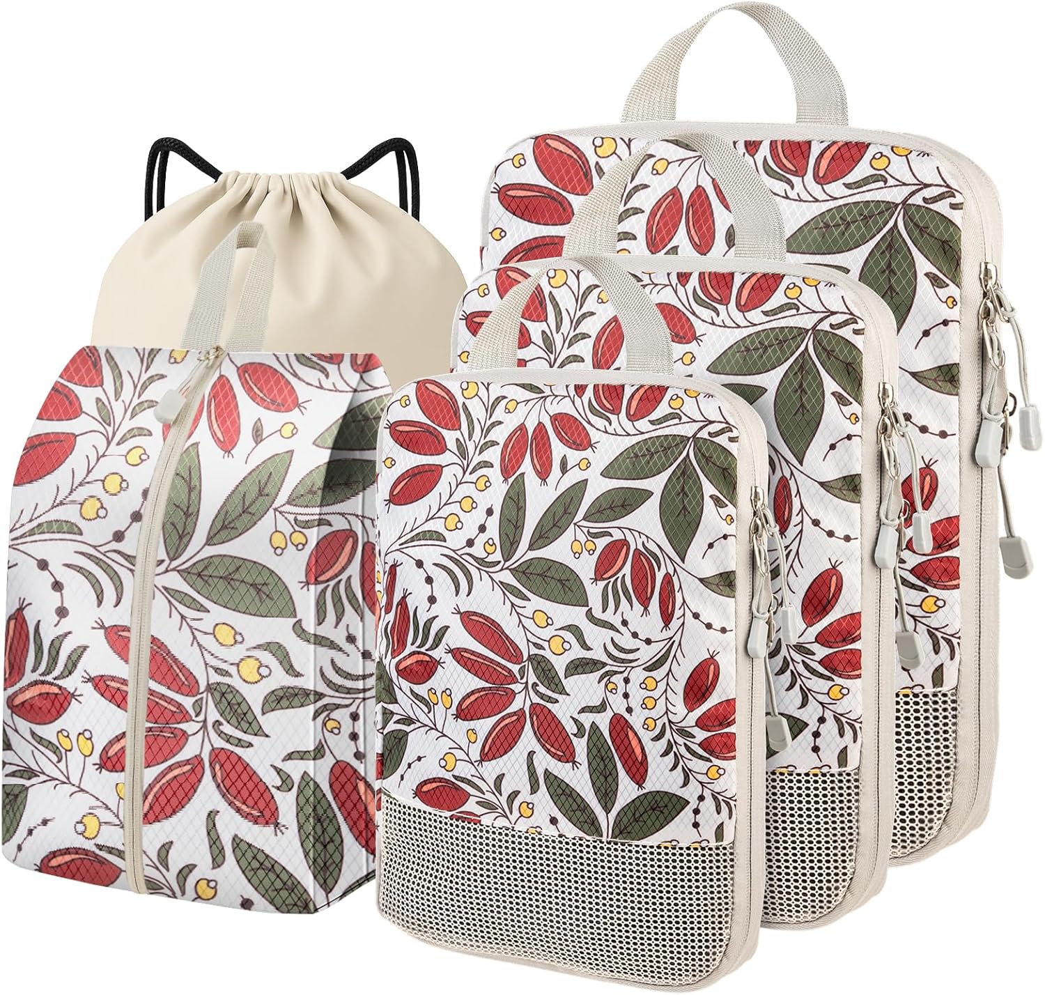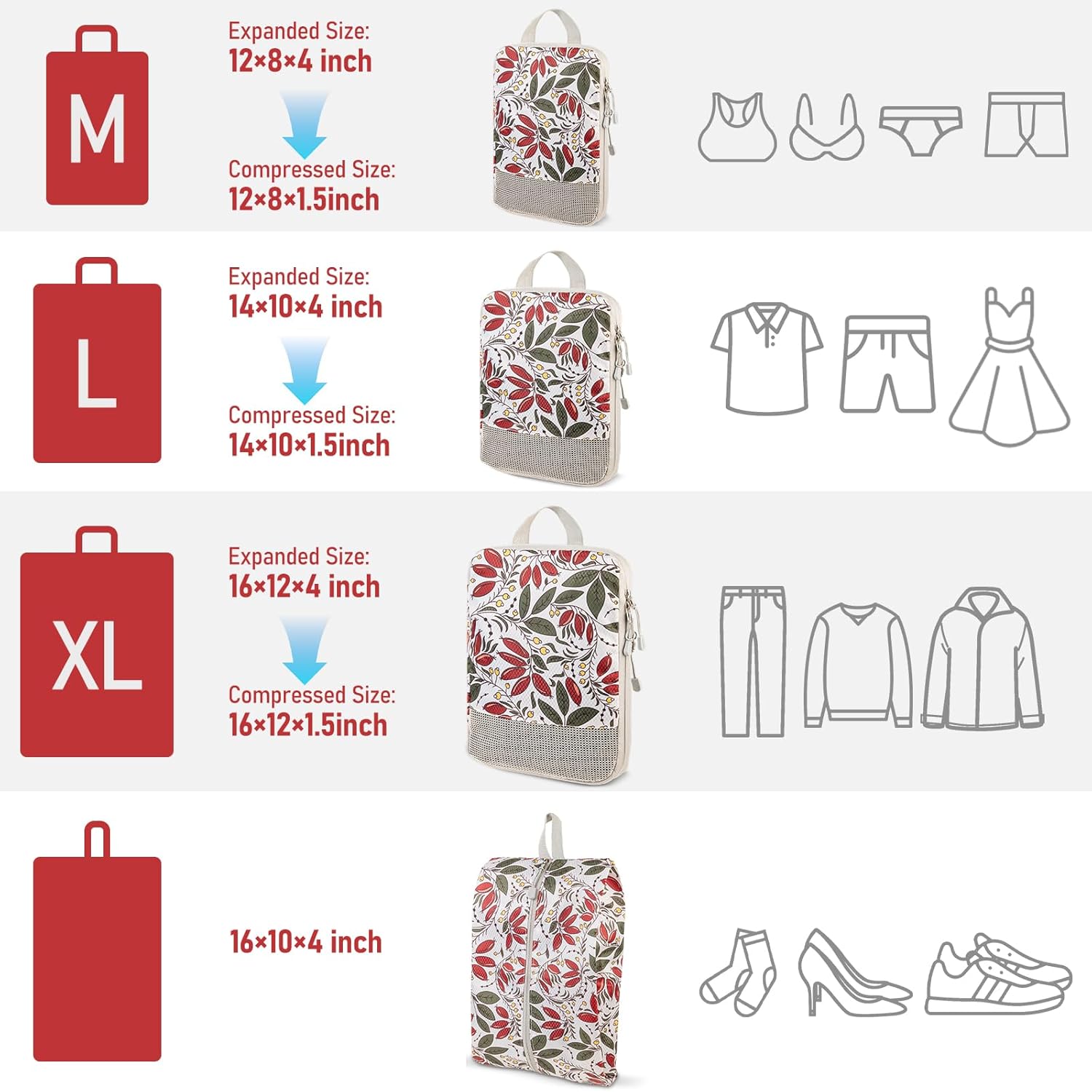 - Package Include: 1*XL Packing Cube(16*12*4 inch),1*L Packing Cube(14*10*4 inch), 1*M Packing Cube(12*8*4 inch), 1*Shoes Bag(16*10*4 inch), 1* Drawstring Bag(17.1x13.5 inch)