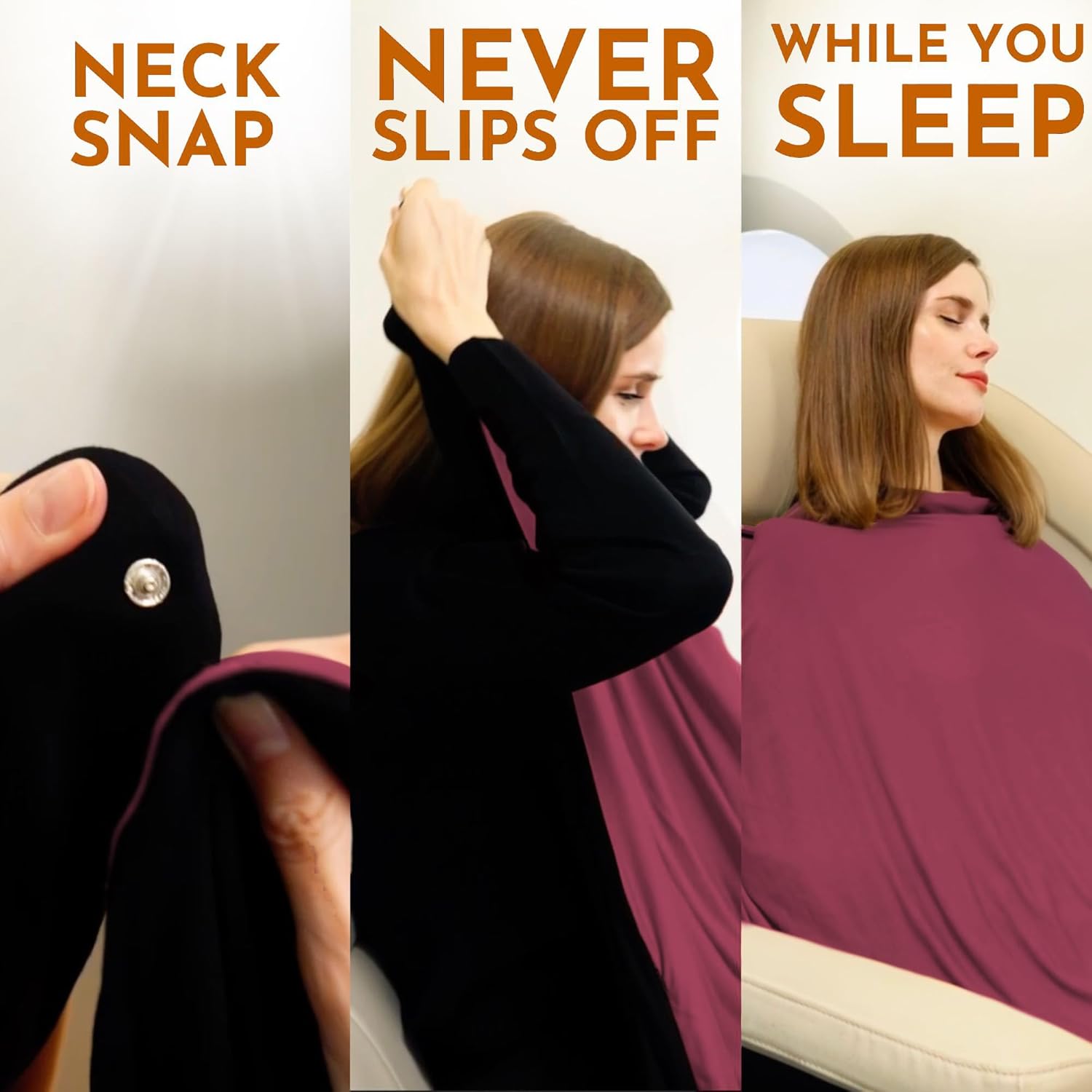 - Convenient for Travelers: Neck snaps keep the blanket secure during sleep, and it packs easily into a compact bag that doubles as a pillow or personal item—perfect for airplane travel essentials.