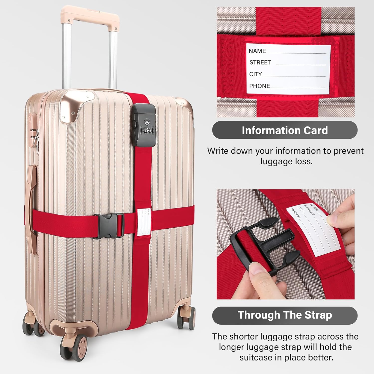 Luggage Straps, Red TSA Approved Luggage Strap Belt with Combination Lock for Suitcases, 2 Pack Adjustable Heavy Duty Cross Suitcase Straps with Name Tags for Travel, Carry On Bags, Protect Luggage