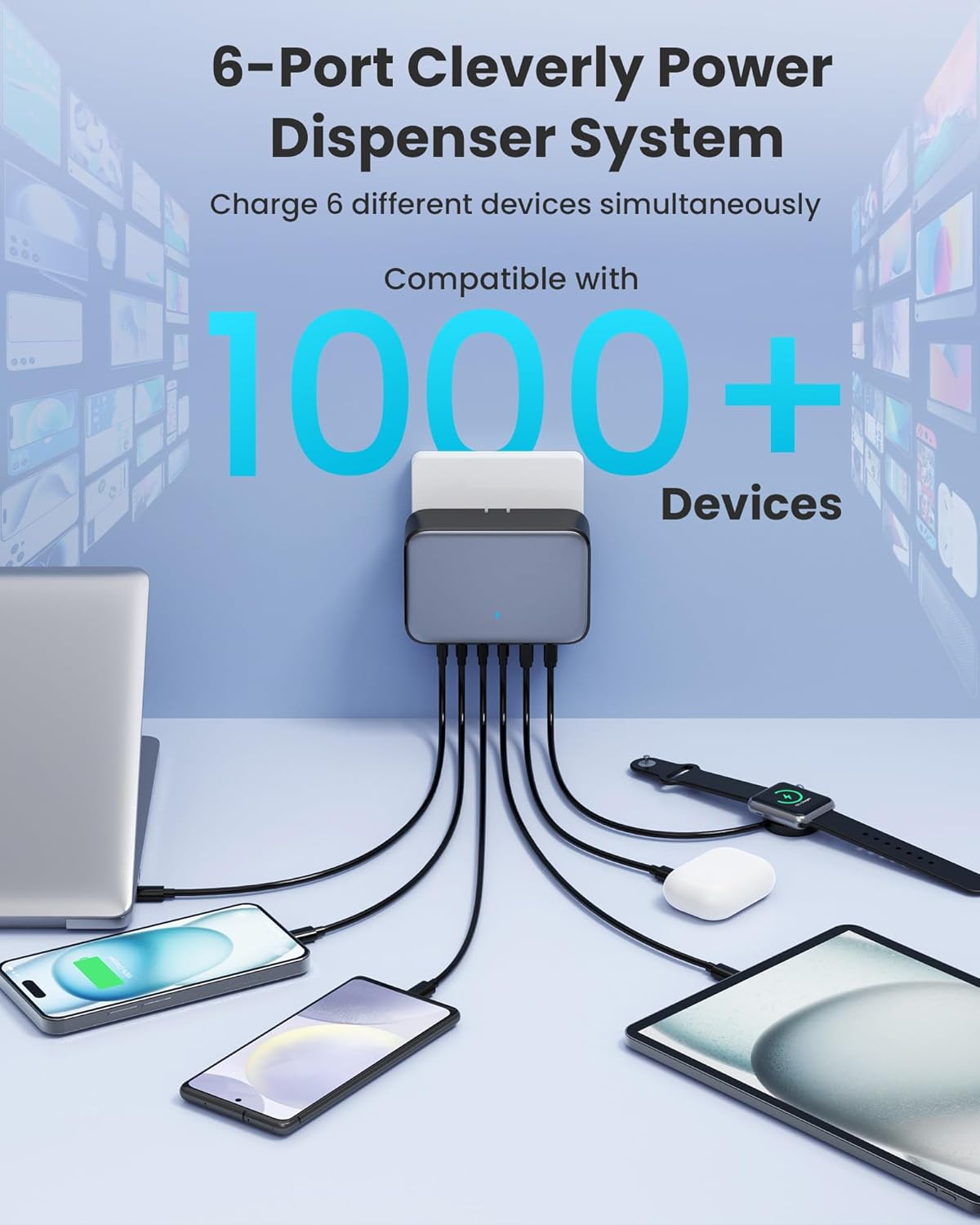 - ăUSB Charging Station for Multiple Devices 6 PortsăPower up multiple devices simultaneously with 6 ports, 4 USB-C Ports and 2 QC USB-A Ports, delivering high-speed charging for Macbook Pro 13â (with our usb c1 port of 65w),iPhone 16/15, Android Samsung Galaxy S23. Universal Compatibility for any smartphones, tablets, laptops and more USB smart devices.
