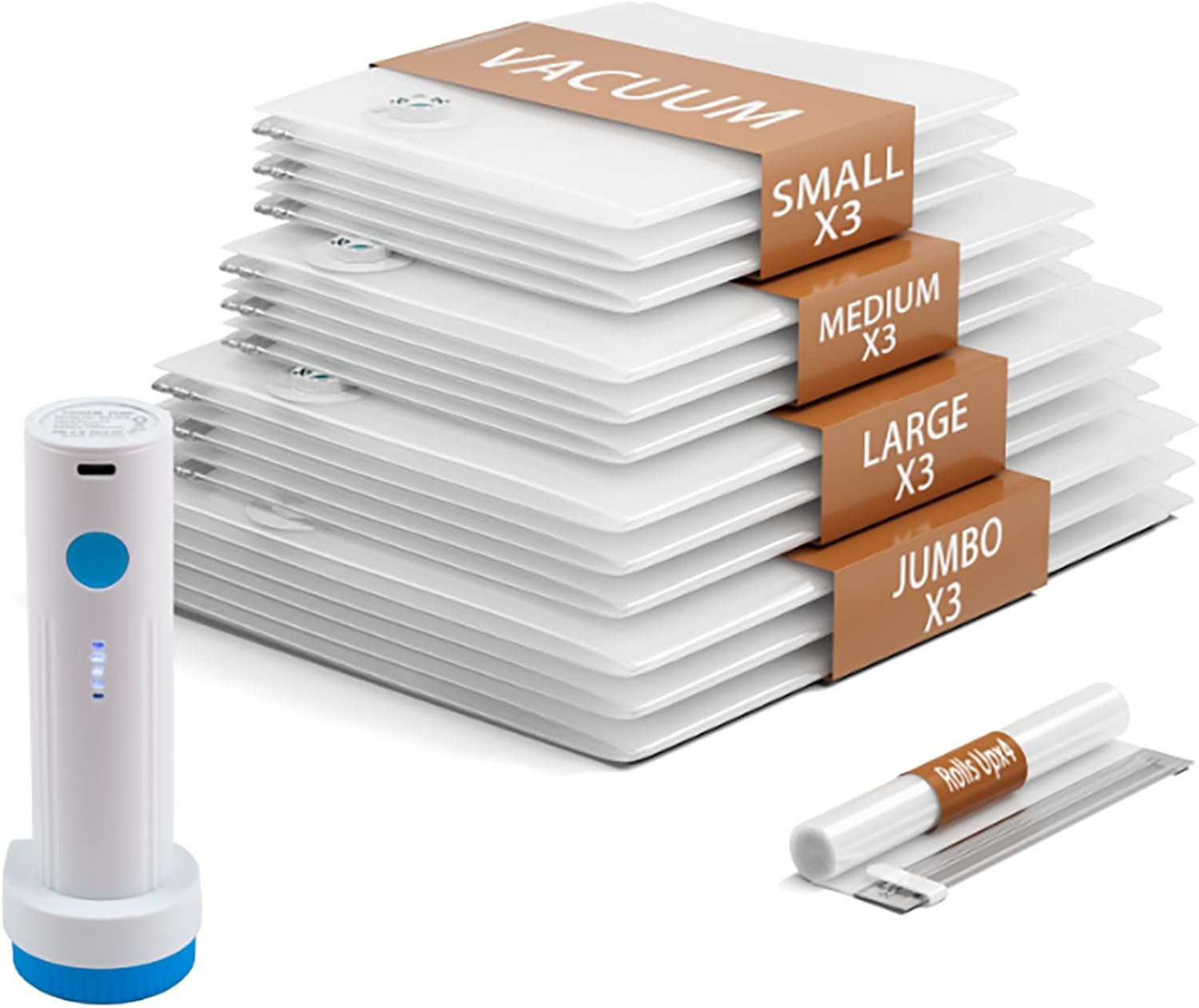 Vacuum Seal Bags for Clothing Travel, 16 Pack (3 Jumbo/3 Large/3 Medium/3 Small/4 Roll) Vacuum Storage Bags with Portable Electric Pump, Space Saver Bags for Luggage, Suitcase, Clothes, and Blankets