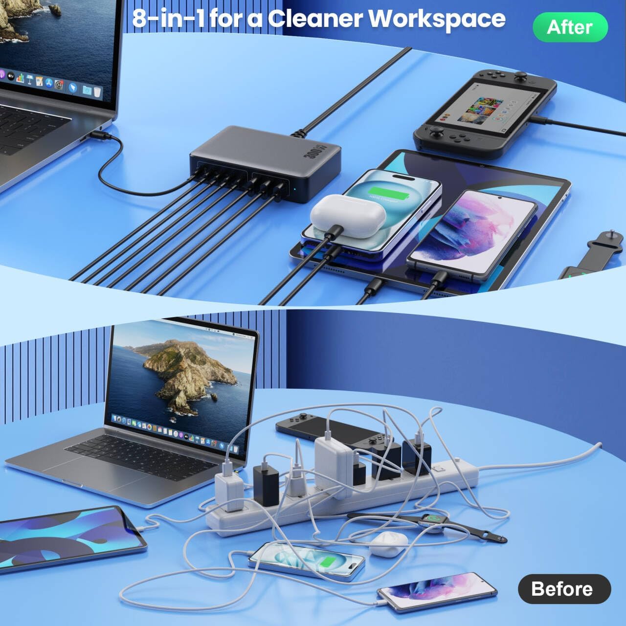 - ă300W Super Fast 8-in-1 Usb C Charger BlockăOur USB charger provides multi charging options to meet your different needs. With 5*USB C ports and 3*USB A ports, no need for more adapters, you can use just one outlet to plug in laptops, tablets, smartphones, Bluetooth speakers and other small gadgets like earbuds, smartwatches, game consoles etc.Our USB C charging stations feature 8 independent output ports, ensuring all devices can charge simultaneously at full speed without power sharing and disconnection,this 8-in-1 charging station will reduce your accessories burden and help you create an organized and clean desktop.