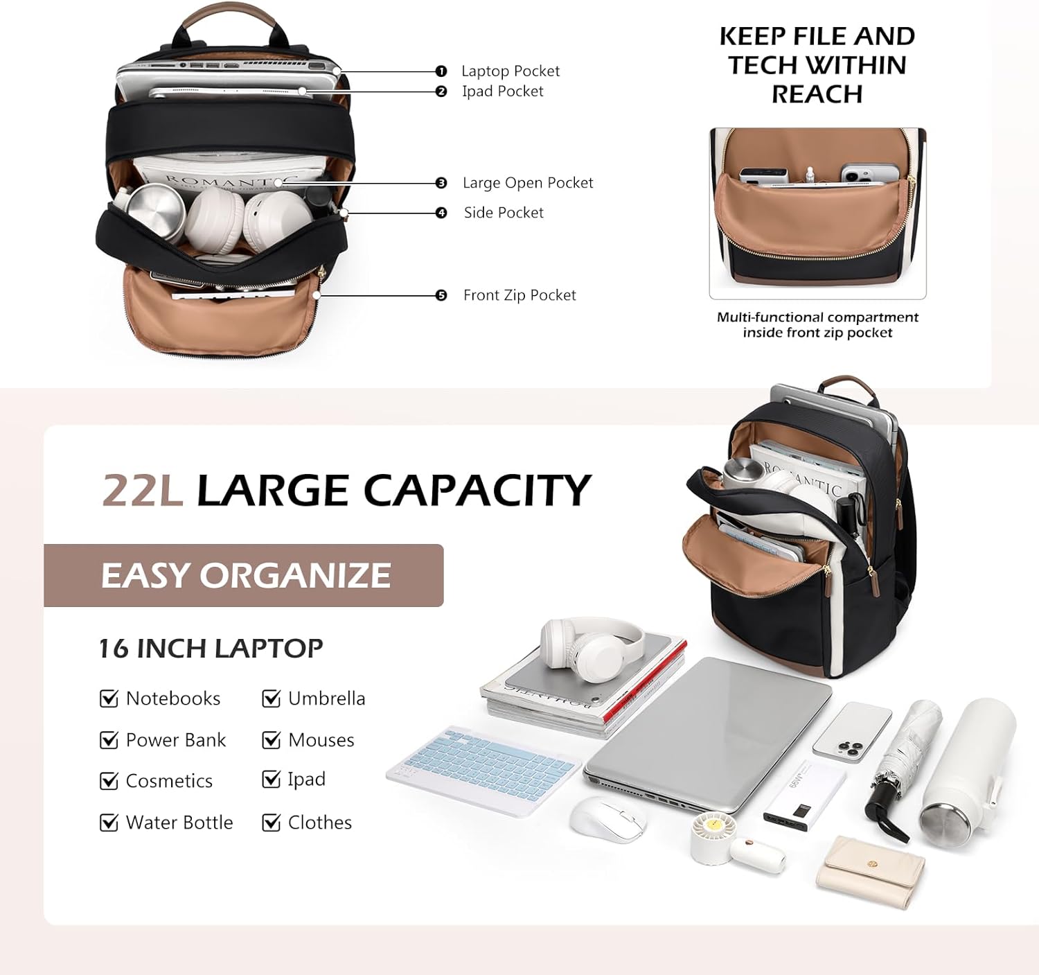 Laptop Backpack for Women Travel Carry On Bag Weekender Business Multilayer Personal Item Backpack,16 Inch,WBlack