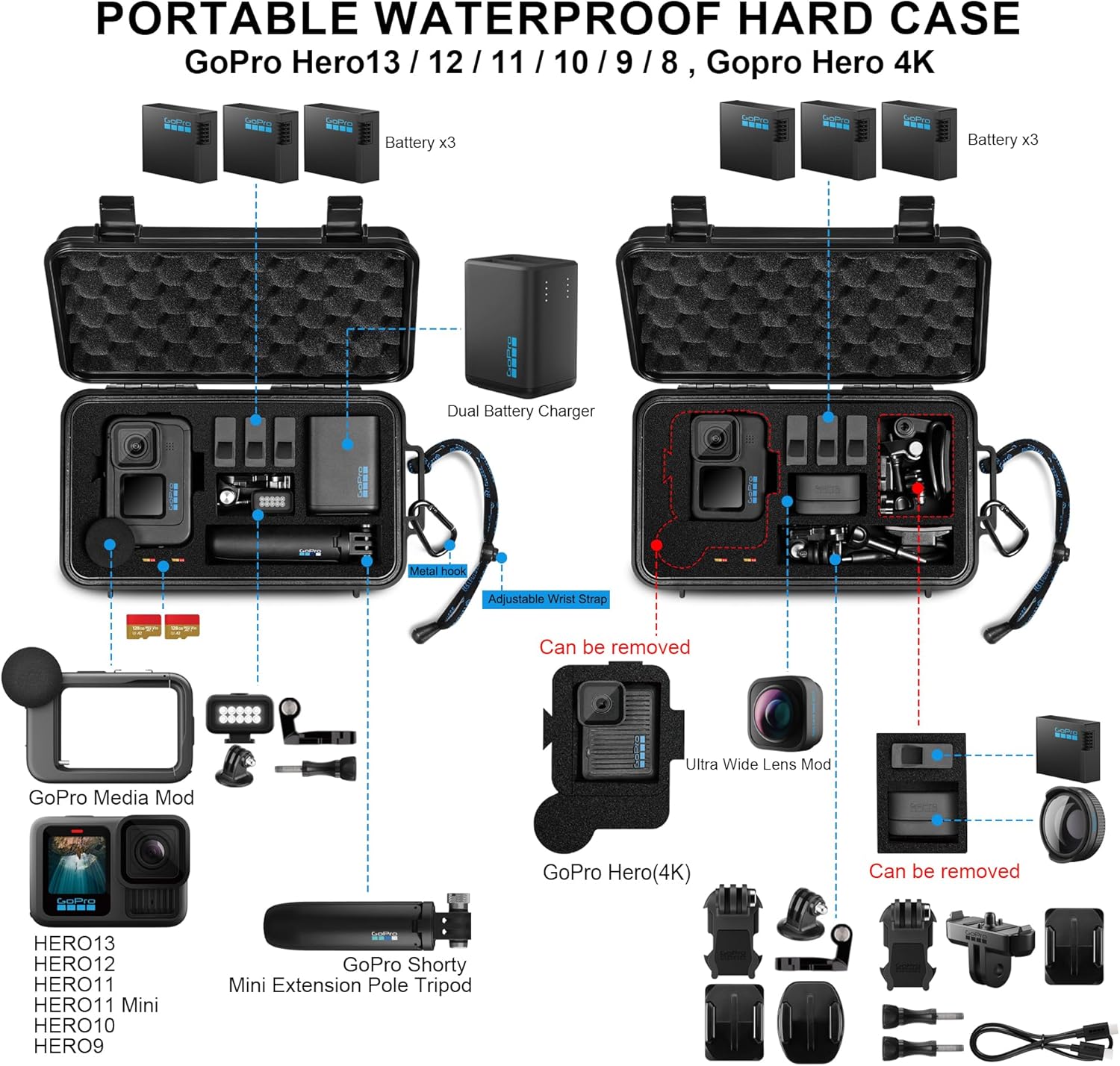 - Custom Storage: This Lekufee waterproof case includes a customized pre-cut sponges, adjustable wrist strap, metal hook. Designed for your Gopro Hero 13,Gopro Hero 12/11/10/9 & Gopro Media Mod, and accessories.