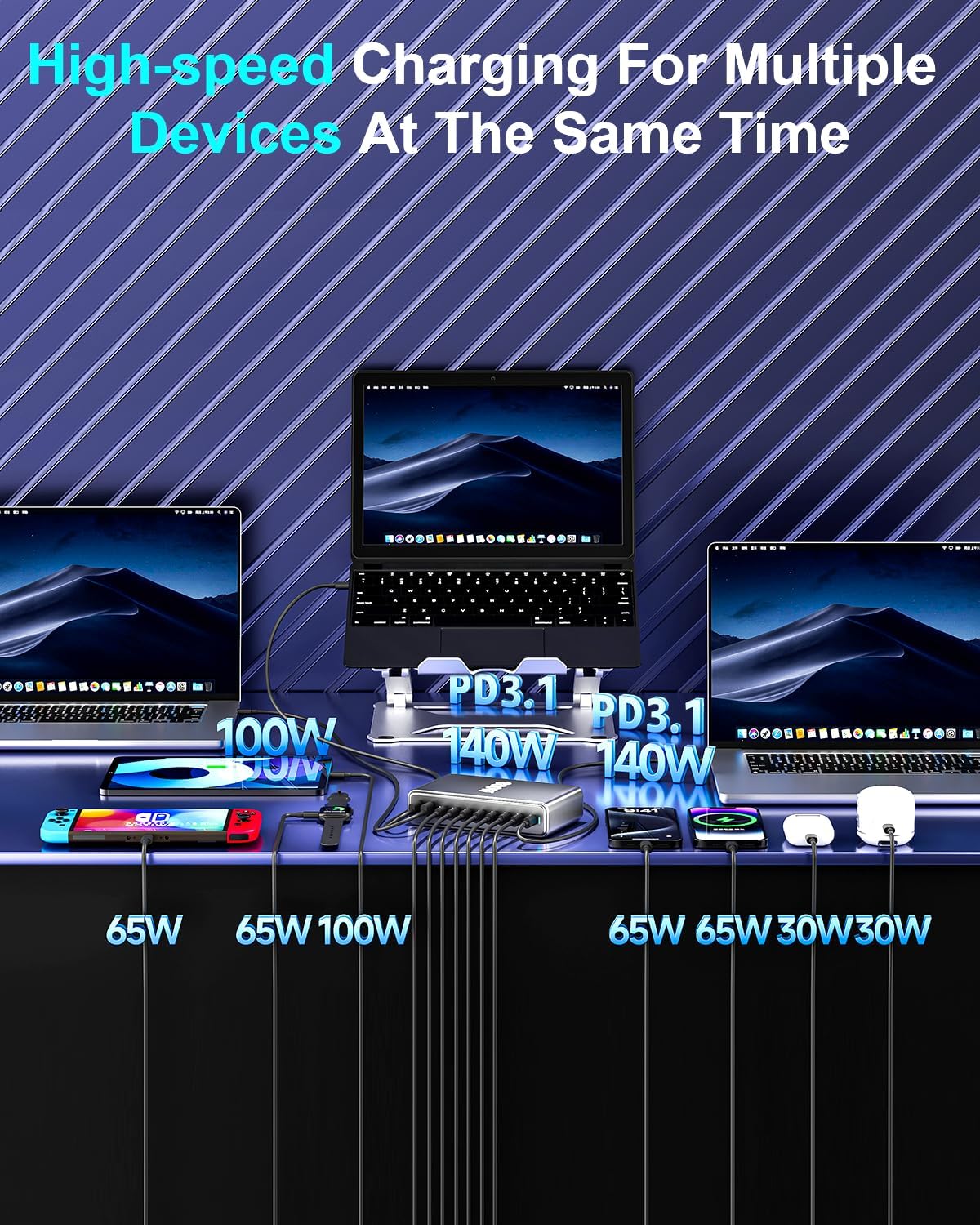 - Wide Compatibility: The 800W USB C charging station supports PD3.1,PD3.0/PPS, QC, PE2.0, AFC, FCP, SCP, 5V/3A fast charging protocols and is compatible with MacBook Pro 16“, 14”, 13”, MacBook Air, iPad Pro , iPhone 16 Pro/15 Pro/14 Pro Max/13/12, Switch, Samsung Galaxy S23 Ultra/S22, Steam Deck and more