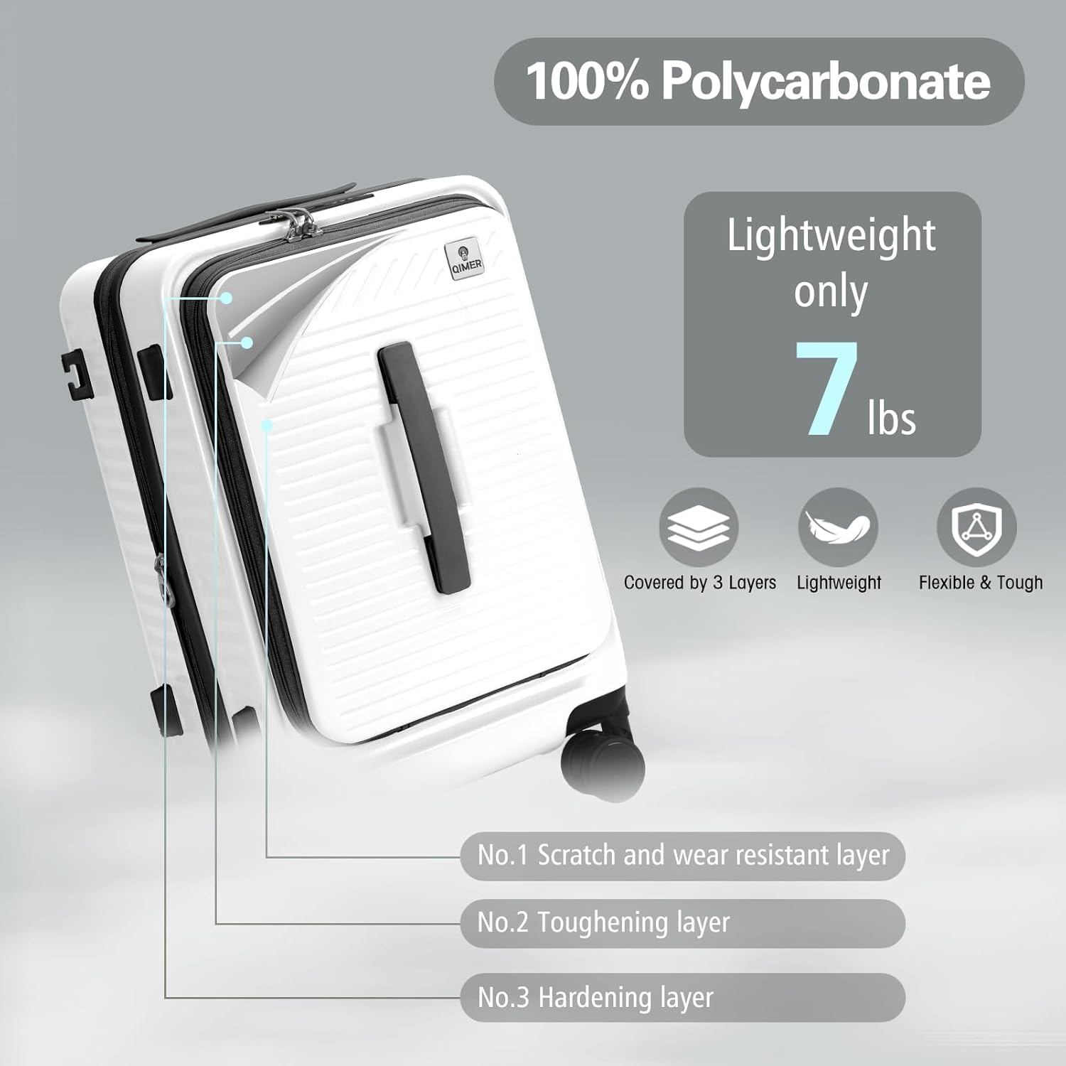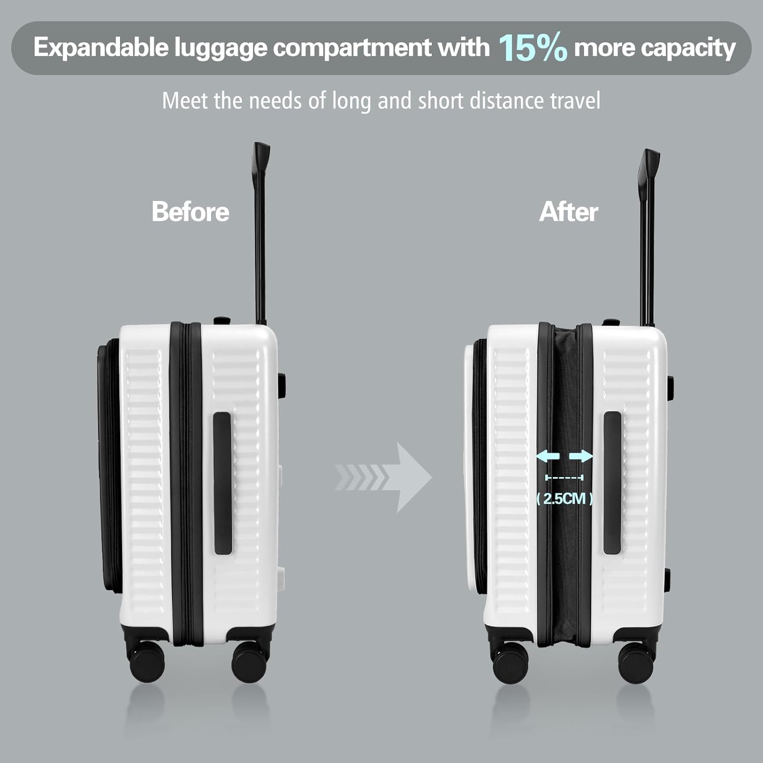 - Front-Opening Suitcase: This hardshell suitcase with wheels features a front-opening design. The front compartment includes a 15.6-inch laptop compartment, a zippered compartment, and a mesh pocket for space-saving access. Effortlessly open and close your suitcase like never before!