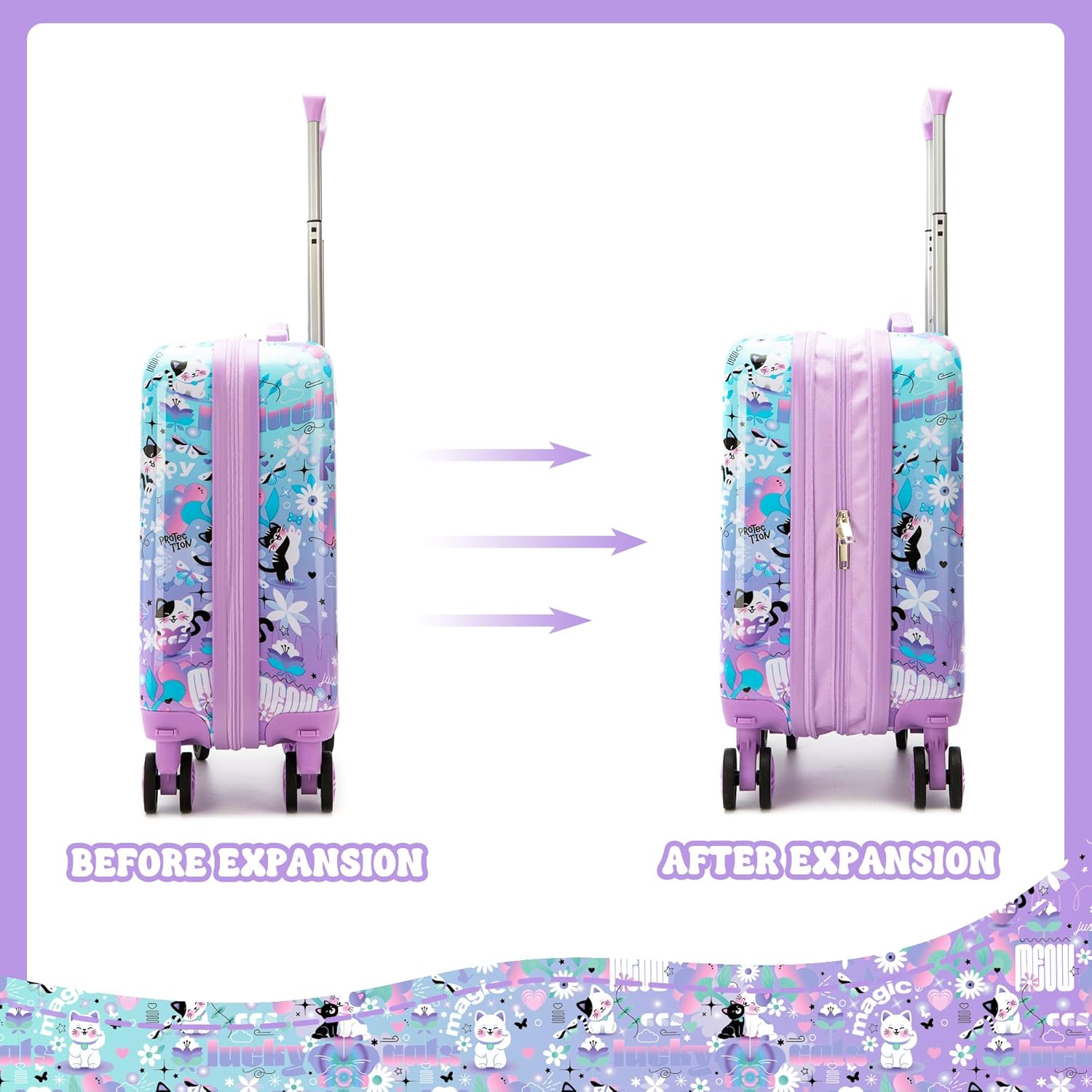 - The smooth rolling spinner wheels and telescoping handle enables children to effortlessly push or pull the luggage that feels like floating on air. The lightweight hardshell suitcase is sturdy and holds a lot, giving your young expolrer to take charge of their adventure, to pack and unpack with confidence and independence.