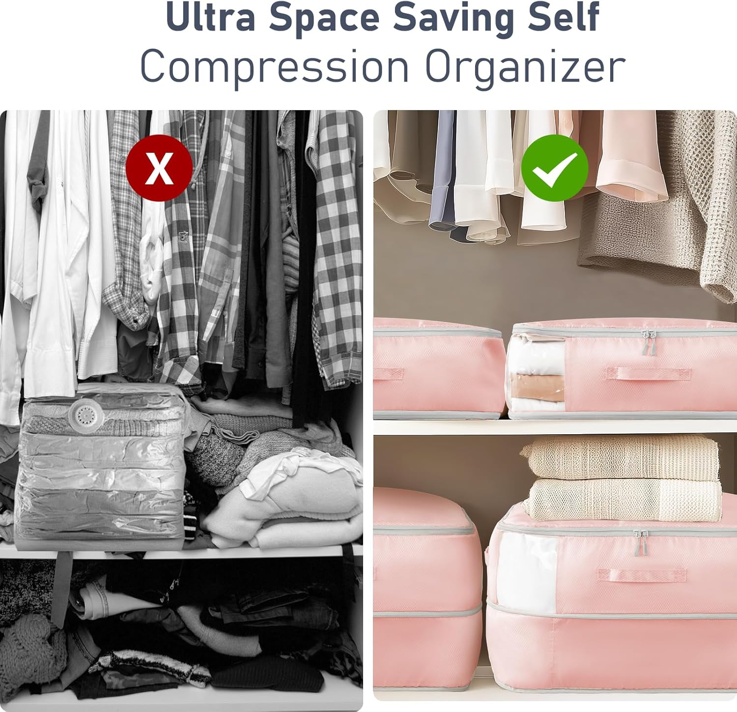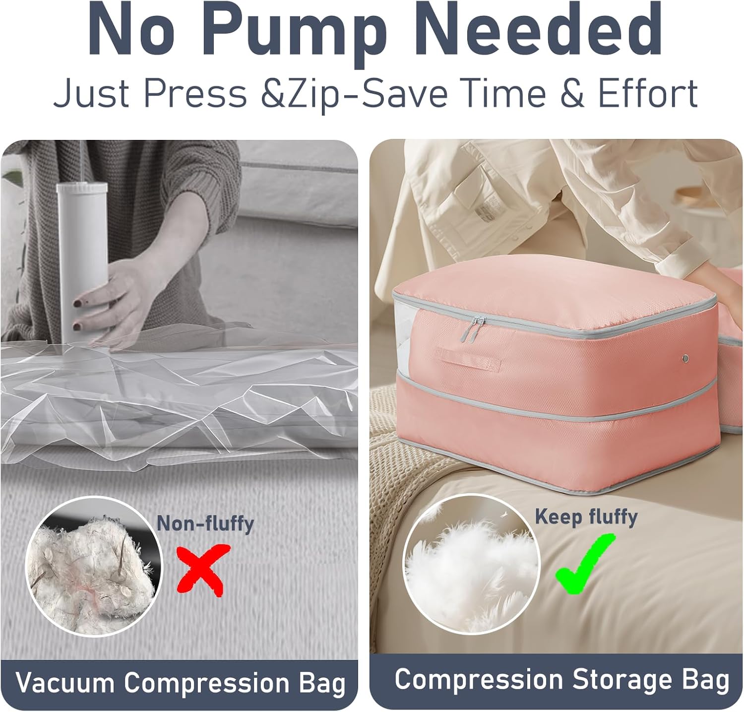 - Innovative Compression Storage Bags:Our compression organizer keeps the air inside during compression, protecting the fibers and down in your clothes and comforters from damage. Save space while ensuring that your items remain fluffy and as good as new when you open them the following year! They can be safely stored in your attic or basement. The dimensions of the compression bags are 11.8 inches (compressed: 5.9) x 16.54 inches x 21.26 inches
