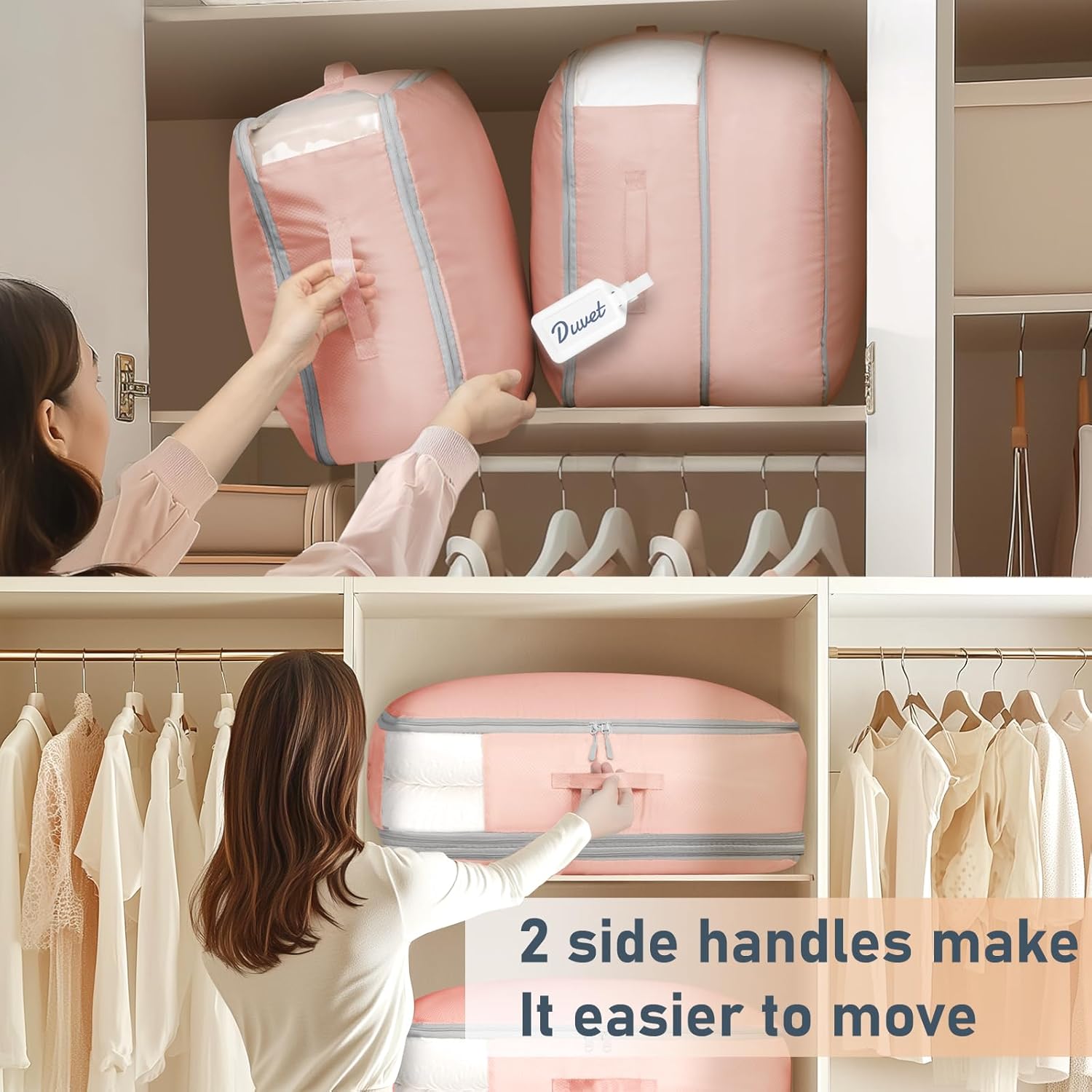 - Perfectly Size:Our organizer bag offer ample capacity without being cumbersome or space-consuming. Each bag can hold a large winter comforter or 6-8 down jackets. They are perfectly suited for decluttering your wardrobe and keeping your seasonal items organized and ready for use.Tip: After receiving your quilt storage bags, you can wash or iron the items before use to smooth out any wrinkles that may have occurred during transit. If you encounter any issues, we're more than happy to assist you
