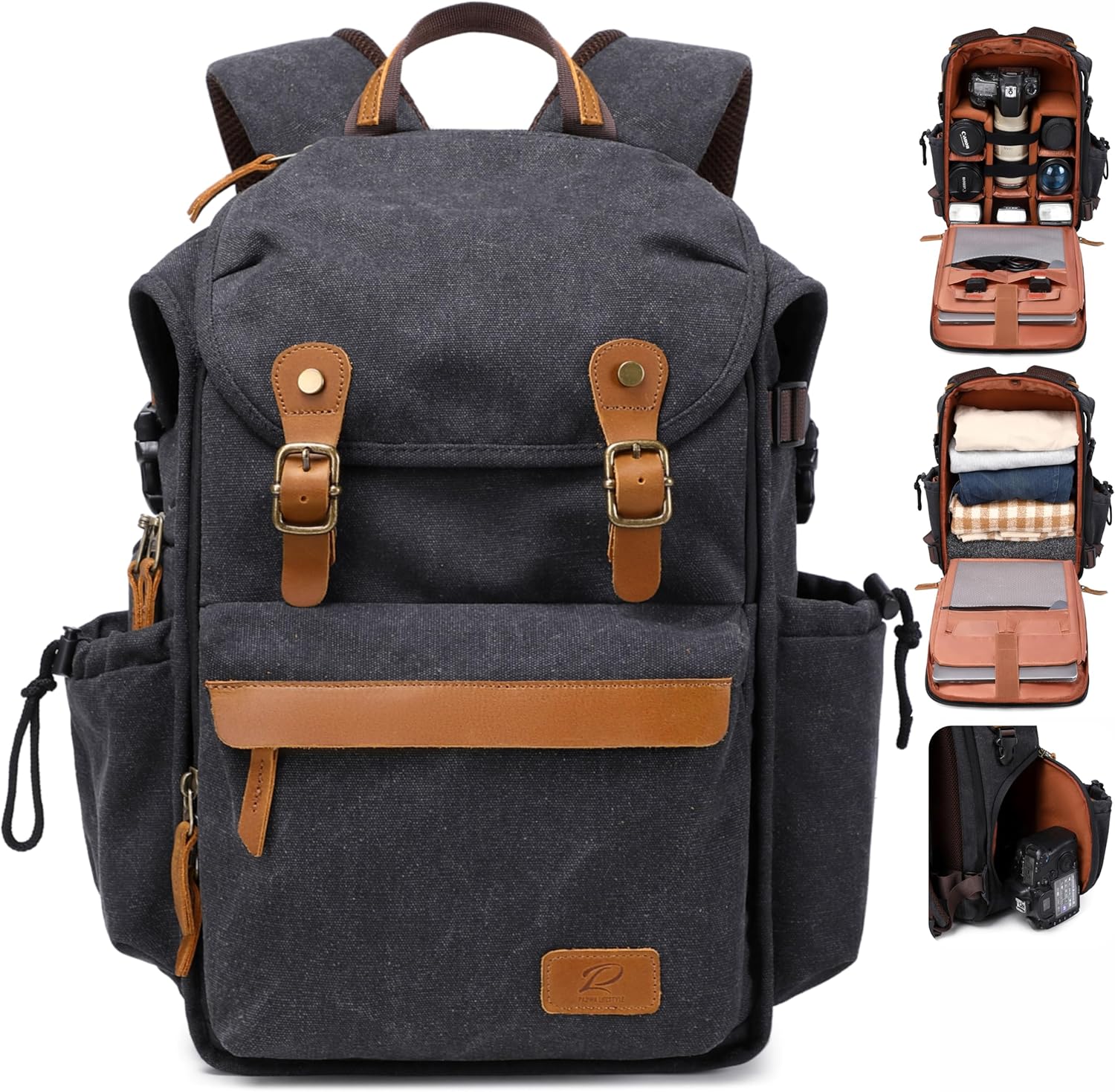 - ๐ท PROFESSIONAL CAMERA BACKPACK : Our Crazy Horse Leather Style weather resistant Canvas camera backpack for Professional photographers, the camera backpack designed comes with 8 pcs removable thick padded dividers (with Velcro Function) to customize the interior space according to your individual needs, and can be used as a professional camera backpack, drone bag, binocular bag and leisure travel backpack.