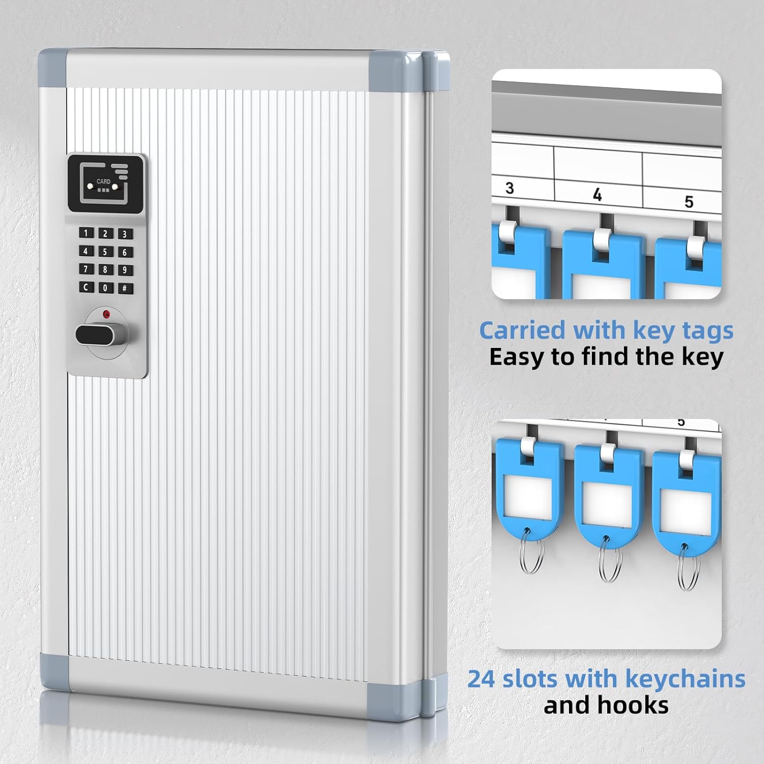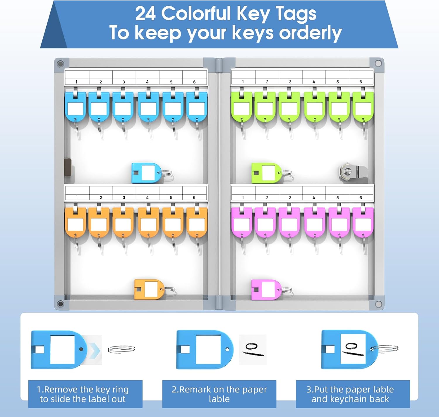 - KEY STORAGE: Keep your keys secure and organized with this key lock box. This key cabinet features 24 hooks and keychains, offering key storage and key organizer functionality for homes, offices, and more. Includes key tags and lables for easy identification.
