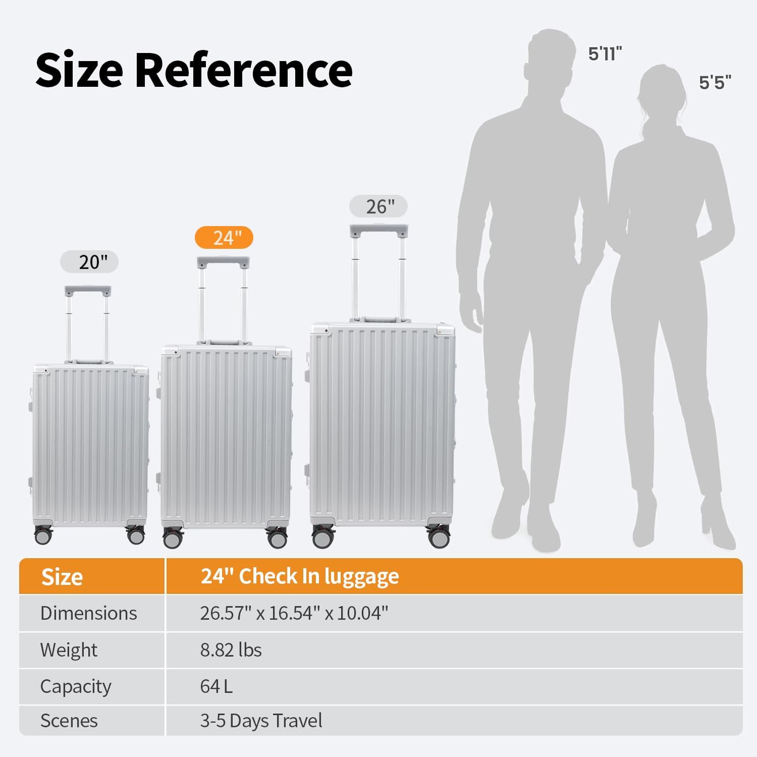 - OVERALL DIMENSION: The size of 24 inch Checked Medium Suitcase: 16.54x9.84x26.18 IN (Including spinner wheels and handle). Weight: 9 LB. Capacity: 64L.