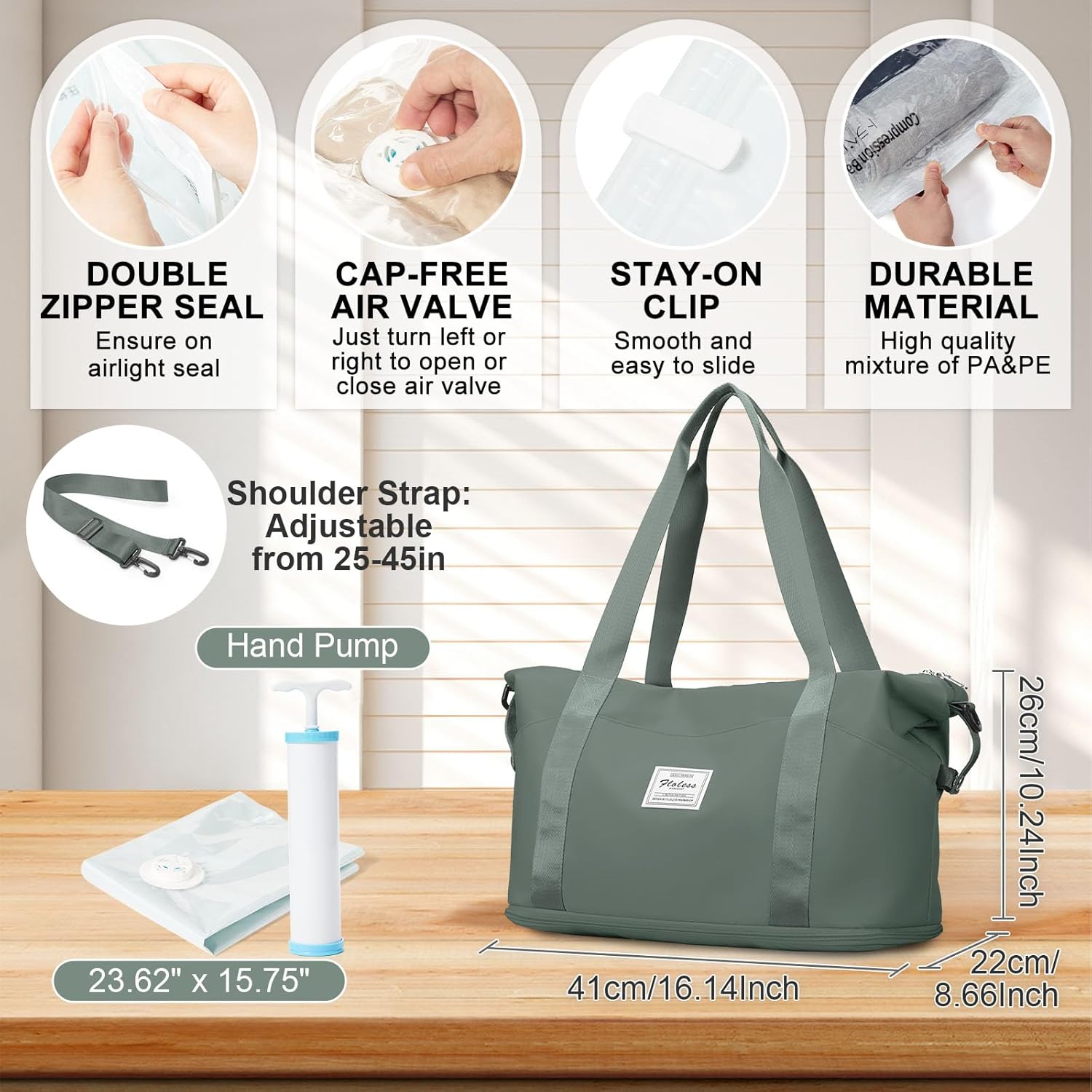 • 【Expanded storage capacity】This travel bag comes with vacuum bags and a manual pump, which are easy to use and require no effort. It can significantly reduce the space taken up by stored items, making it ideal for everyday storage or travel packing, helping you save space.