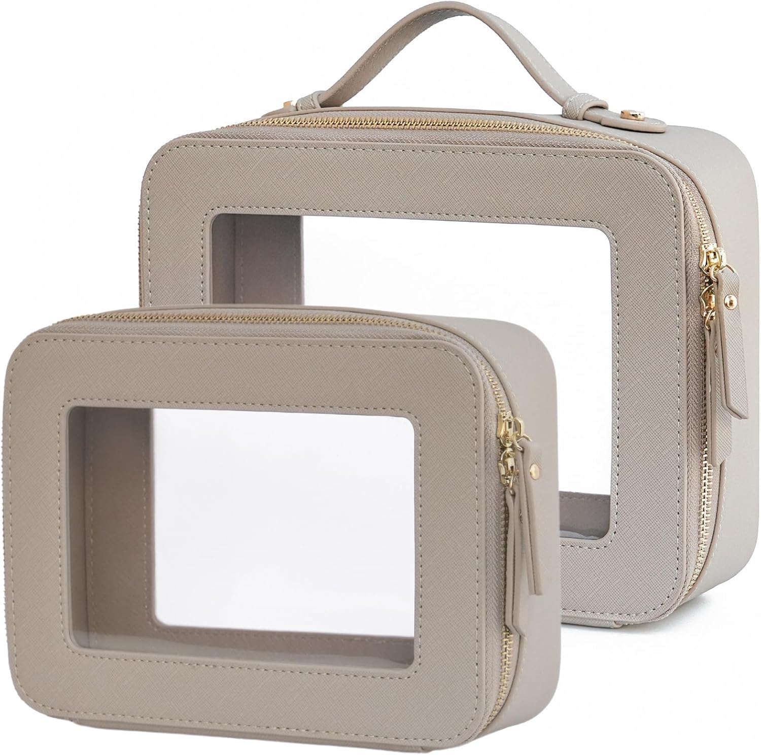• [Premium Material and Durability] – The clear cosmetic case, both the exterior and interior, is crafted from high-grade saffiano faux leather, which is highly scratch resistant, durable and exceptionally easy to keep clean. It features a smooth zipper for secure closure, and elegant light gold metal hardware accents, adding a luxurious and sophisticated touch to the bag's overall design.