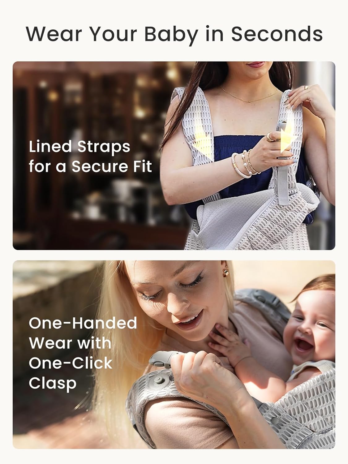 - Slip On the Baby Carrier in Seconds—It’s That Easy! Slide it on like your favorite sweater, then let our innovative sliding quick-release clasps do the work: they align perfectly, click securely in an instant, and let you lock it down with just one hand. All in a single second. Effortless, solo, and a perfect, safe fit every time.