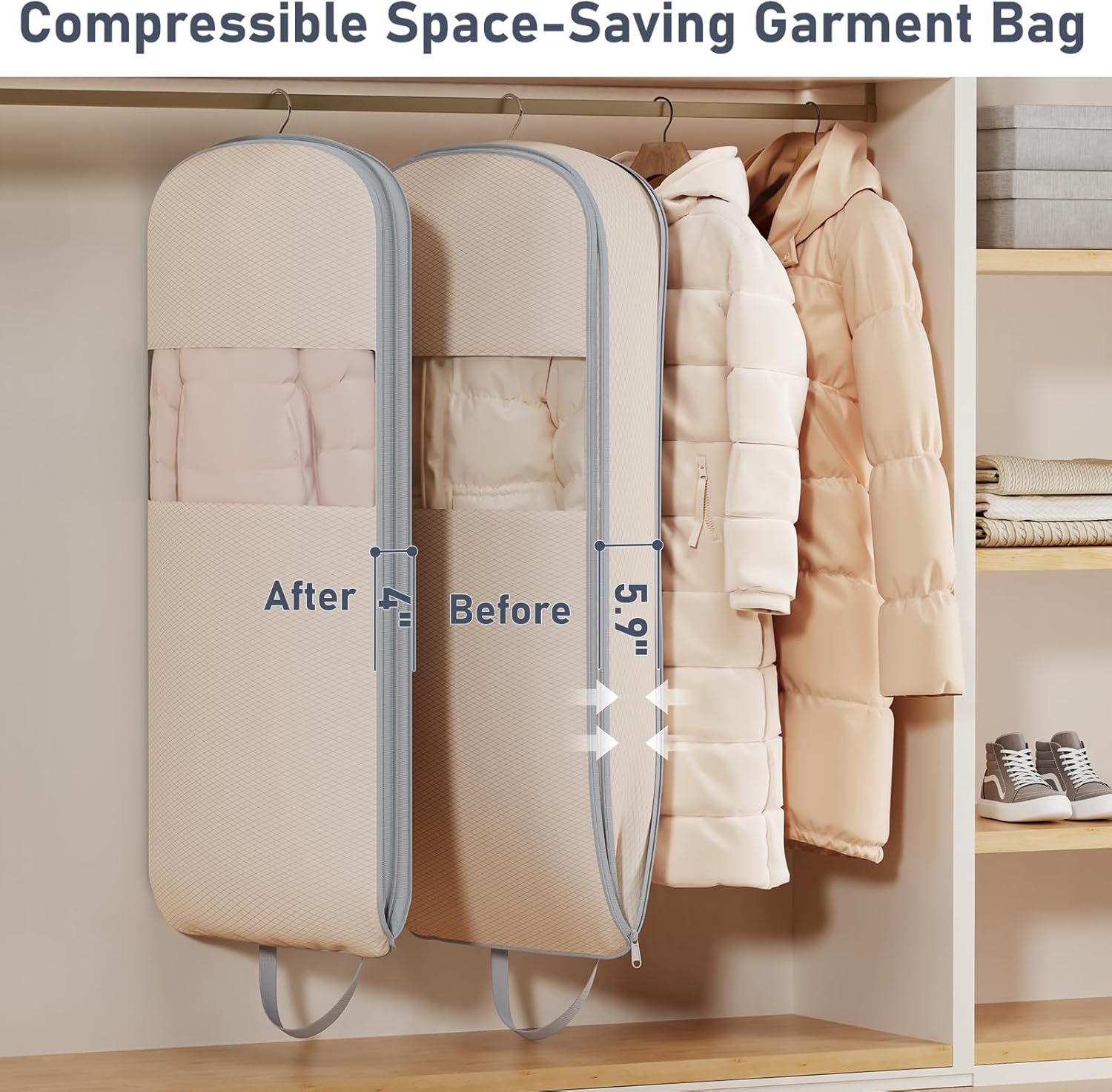 - 【Premium Expandable Garment Bag】: Our ultra-space-saving compression clothing storage bags features a unique dual-layer zipper design that requires no vacuum pump—yet delivers more capacity and flexibility than standard options. Adjust between 4" and 5.9" thickness to store seasonal clothing like coats, suits, dresses, T-shirts, and even fur coats with ease