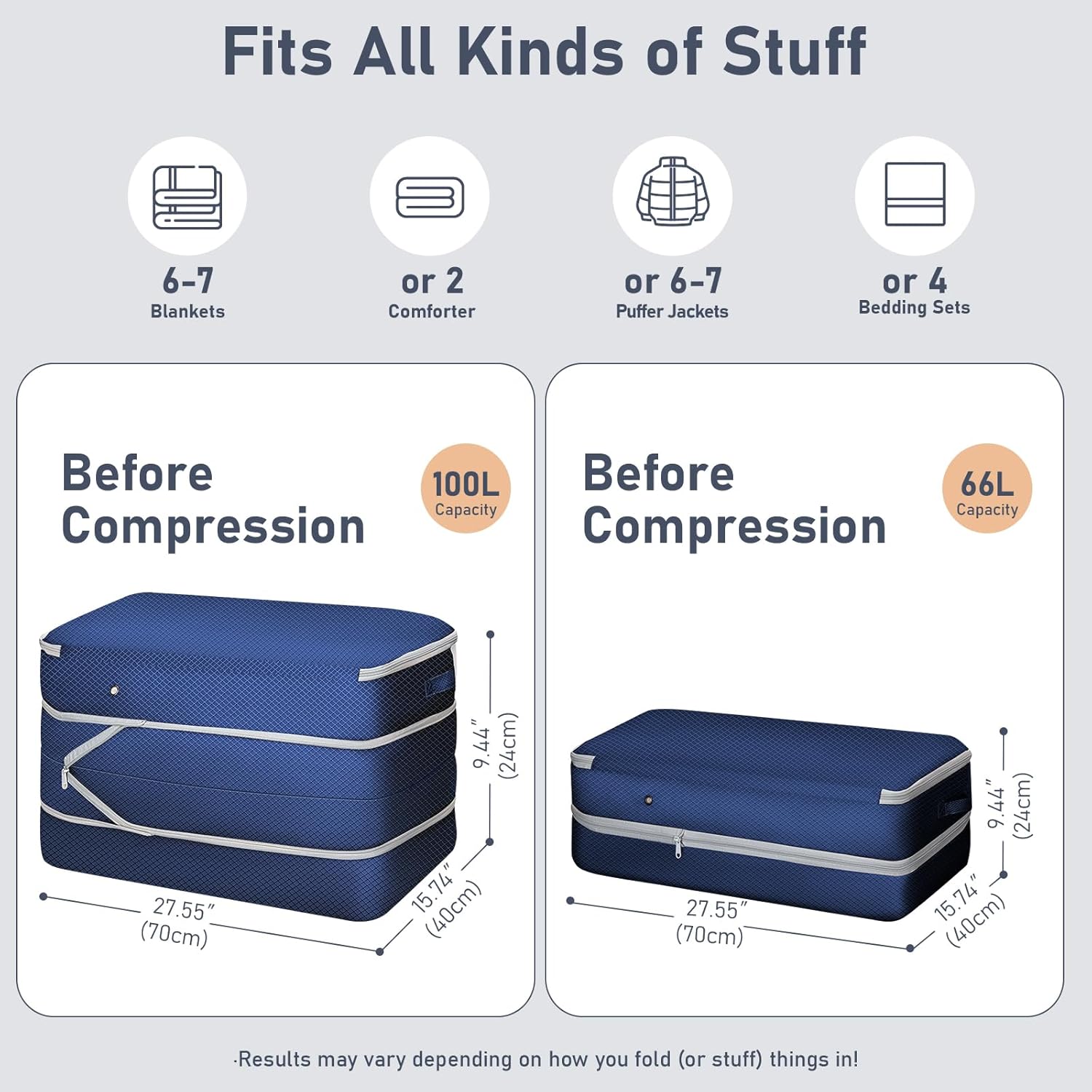 - 100L Extra Large Capacity: This compression bag for storage can accommodate 2 winter queen comforter, or 6-7 blankets, or 4 bedding sets, or5-7 sheets, or 3-4 pillows, giving you more flexibility in storage space management. Note: After receiving your blanket storage bags, you can wash or iron it before use to smooth out any wrinkles that may have occurred during shipping