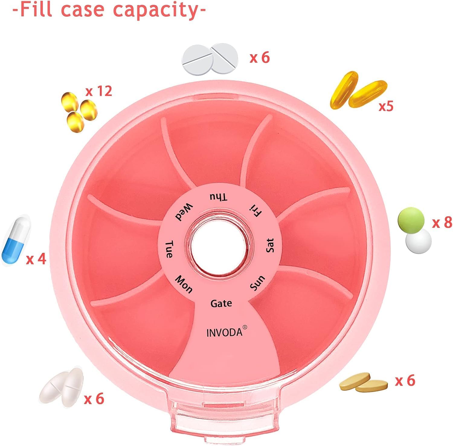 12PCS INVODA Weekly Pill Organizer 7 Compartment Rotating Pill Box for Daily Medication & Vitamins - Portable Travel Pill Case Fish Oil Supplements Vitamins Organizer