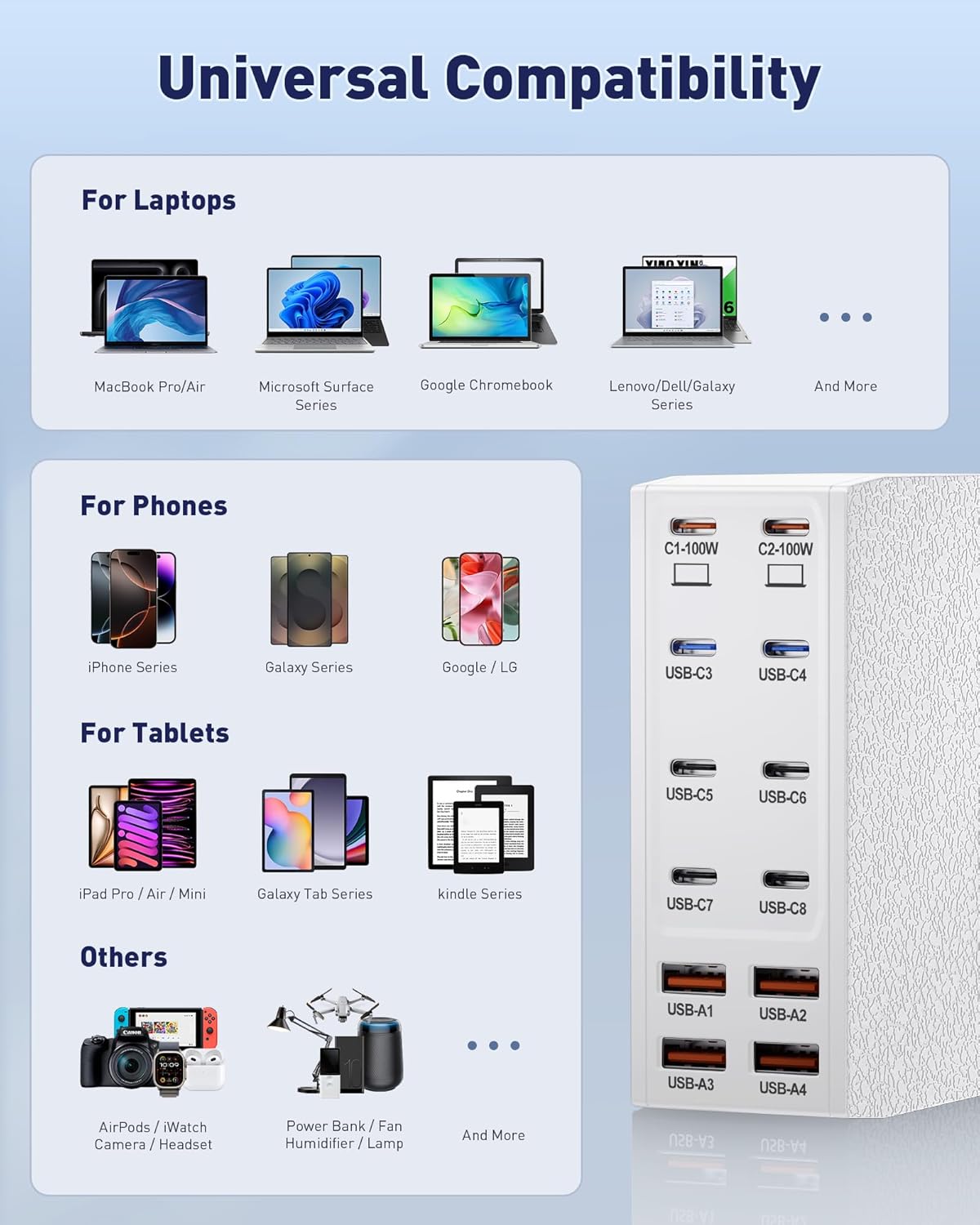 - ăUniversal CompatibilityăOur USB C charging station is equipped with 2*100W and 2*65W fast charging ports, which can charge 3 or more laptops at the same time. Compatible with smartphones, tablets and laptops, suitable for MacBook Pro/Air, Dell XPS, iPad Pro, iWatch, AirPods, Surface Pro, Galaxy S24 Ultra, Switch, Steam Deck, Google Pixel and many other devices.