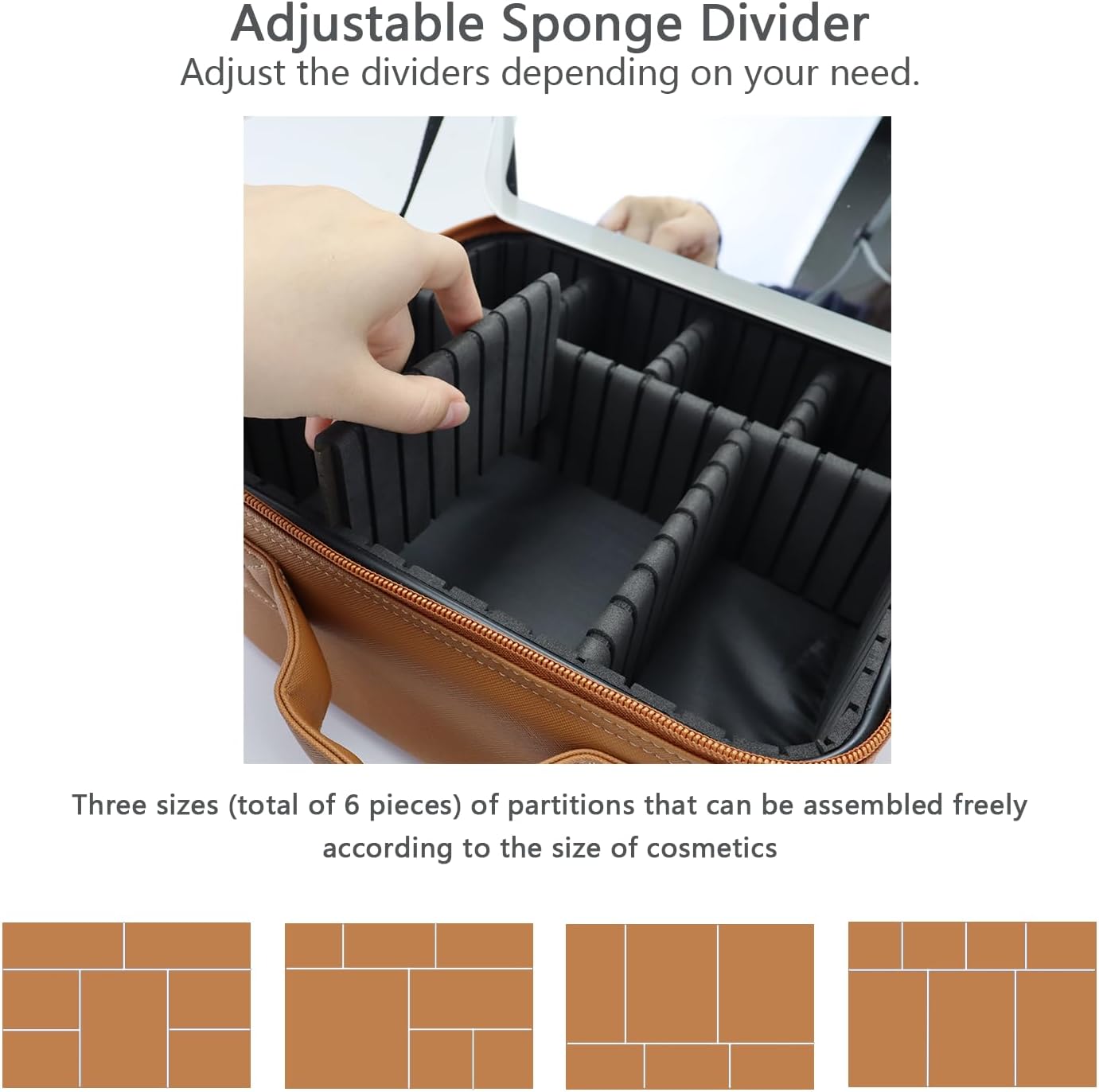 Makeup Bag with Led Mirror,Travel Makeup Organizer with 3 Color Setting & 10X Magnifying Mirror, Portable Storage and Adjustable Dividers Travel Makeup Bag-brown