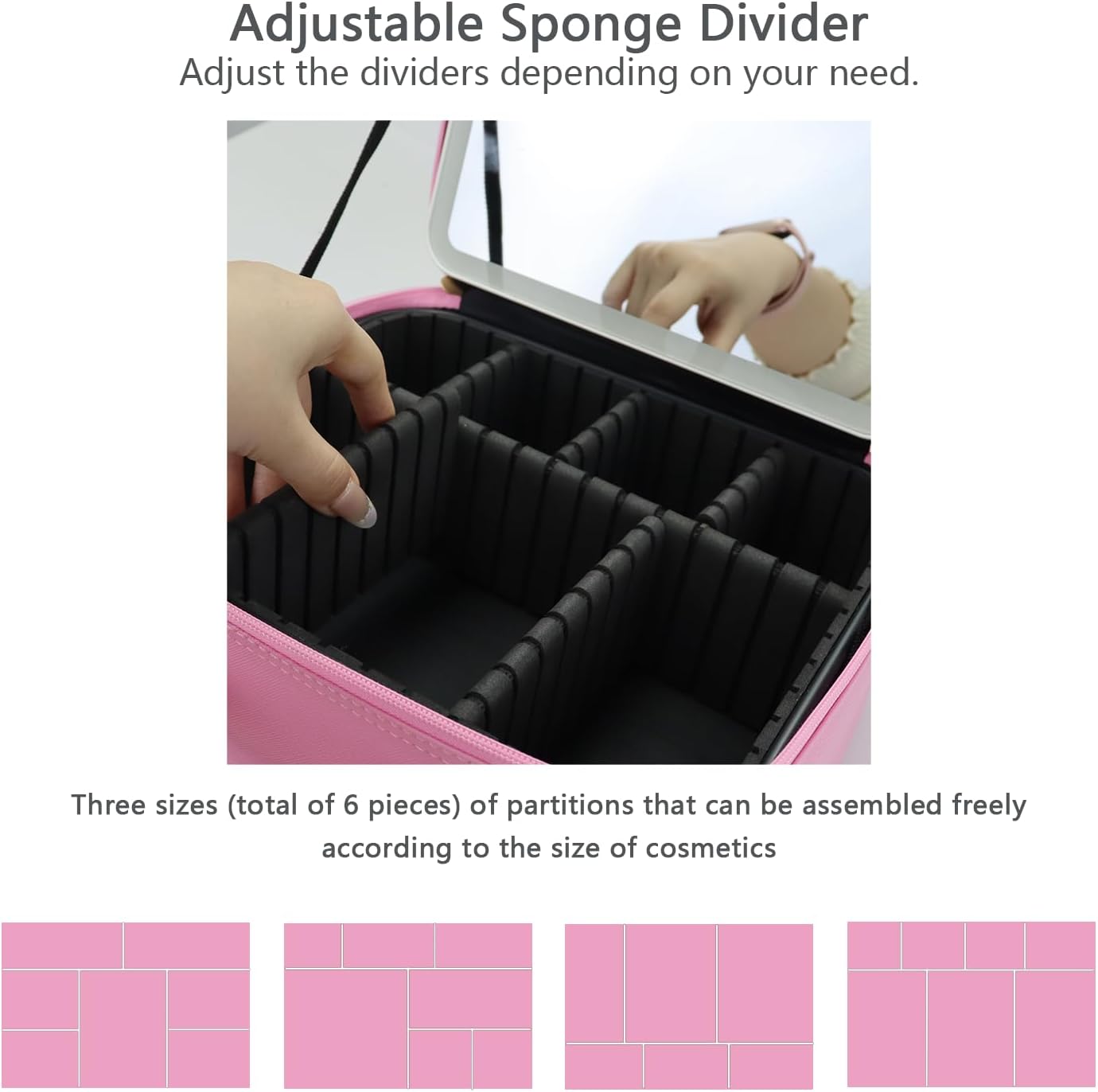 - 【walking powder room】the makeup bag with mirror is 10.3"x 9.1"x 4" and can hold most sizes and shapes of beauty makeup accessories, and the assembleable compartments are flexible enough to hold different sizes
