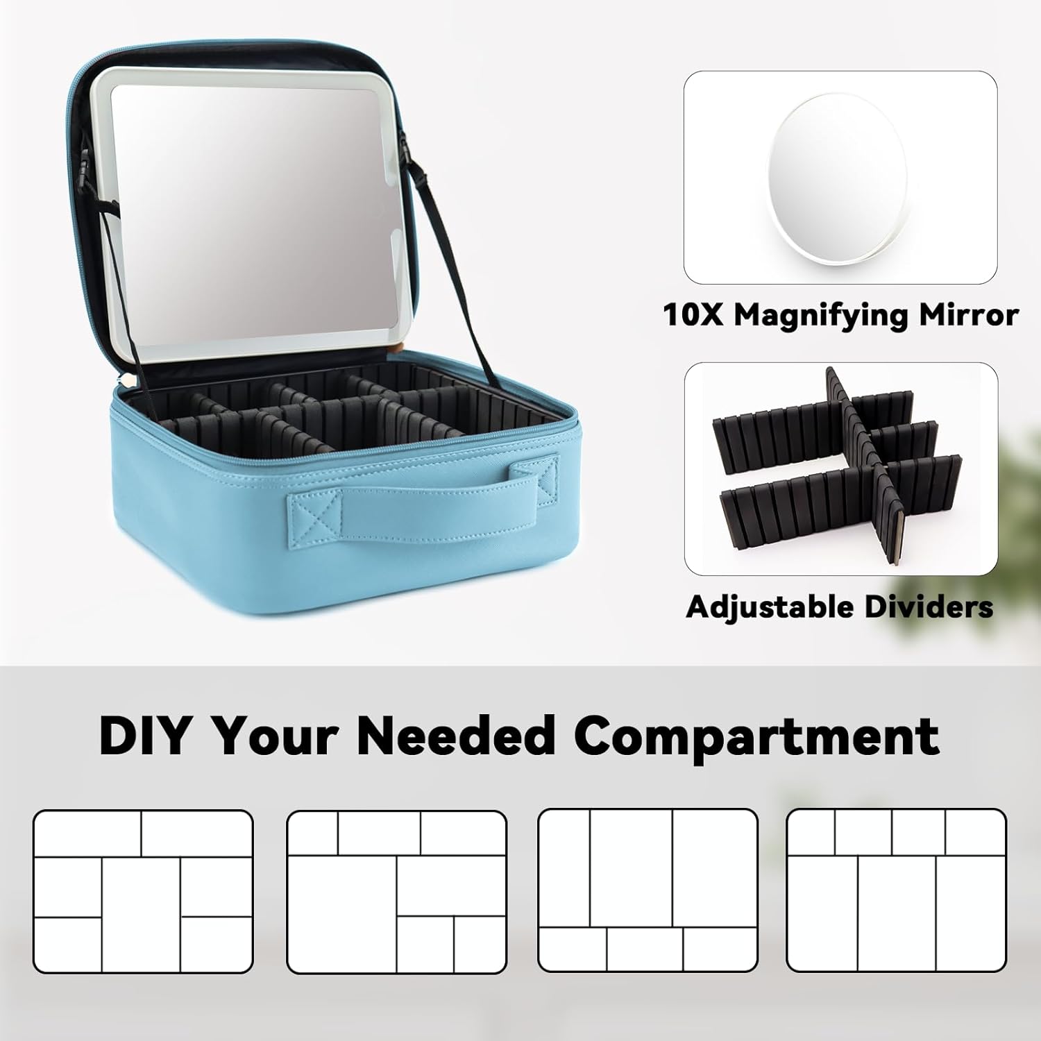 Travel Makeup Bag with LED Mirror and 10x magnifying glass with 3 Lighted Settings, Adjustable Dividers and Makeup Brush Storage Bag Light Blue