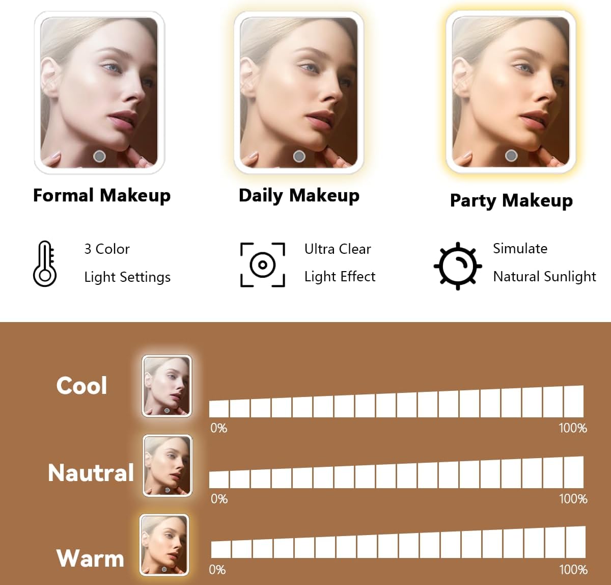 - Removable & Adjustable Brightness High Definition LED mirror:the travel makeup bag with vanity mirror of led light 3 color setting and 10x Magnifying Mirror. and 0-100% adjustable brightness that can be switched. With a long press on the switch, and a short press can adjust the color temperature between cool, natural and warm light.can be disassembled for separate use, and the makeup mirror comes with a separate stand that can be conveniently placed on the table according to your needs.