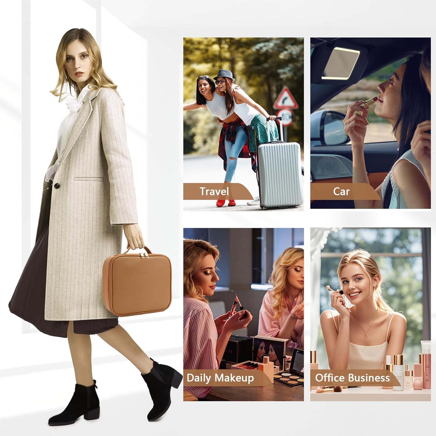 Travel Makeup Bag for Makeup Artists Large Makeup Case,with Mirror 3 Color Setting and Detachable 10x Magnifying Mirror Travel Makeup Bag,Portable Storage and Adjustable Dividers(brown)