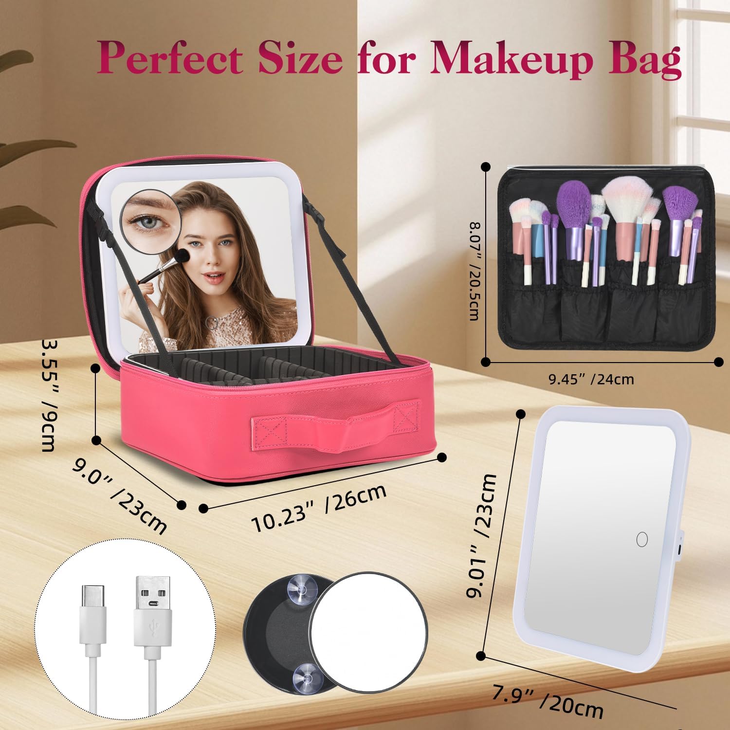 Travel Makeup Bag With LED Mirror,Cosmetic Train Case with 3 Color Setting,Cosmetic Makeup Organizer Bag with Adjustable Dividers,Portable Make up Box with Make up Brushes Holder Storage(Rose)