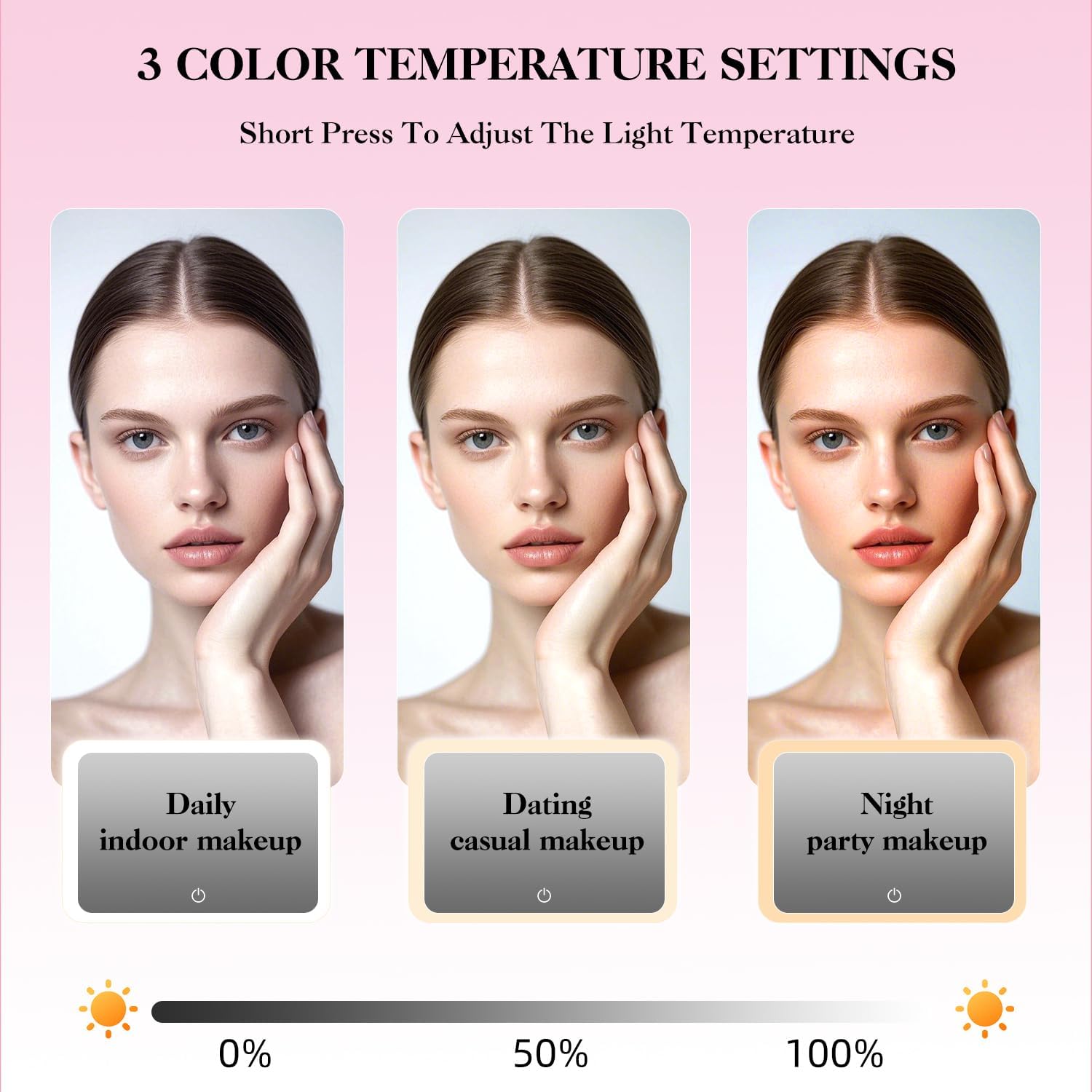 - 3-color Adjustable Light with Makeup Mirror:Simply press the switch to easily adjust the color temperature and switch between cool light, natural light, and warm light to meet the makeup needs of different occasions. Press and hold the switch to adjust the brightness of the light. Whether it's early morning or dusk, makeup bag with led mirror can create the perfect natural lighting effect to ensure that every makeup look is flawless