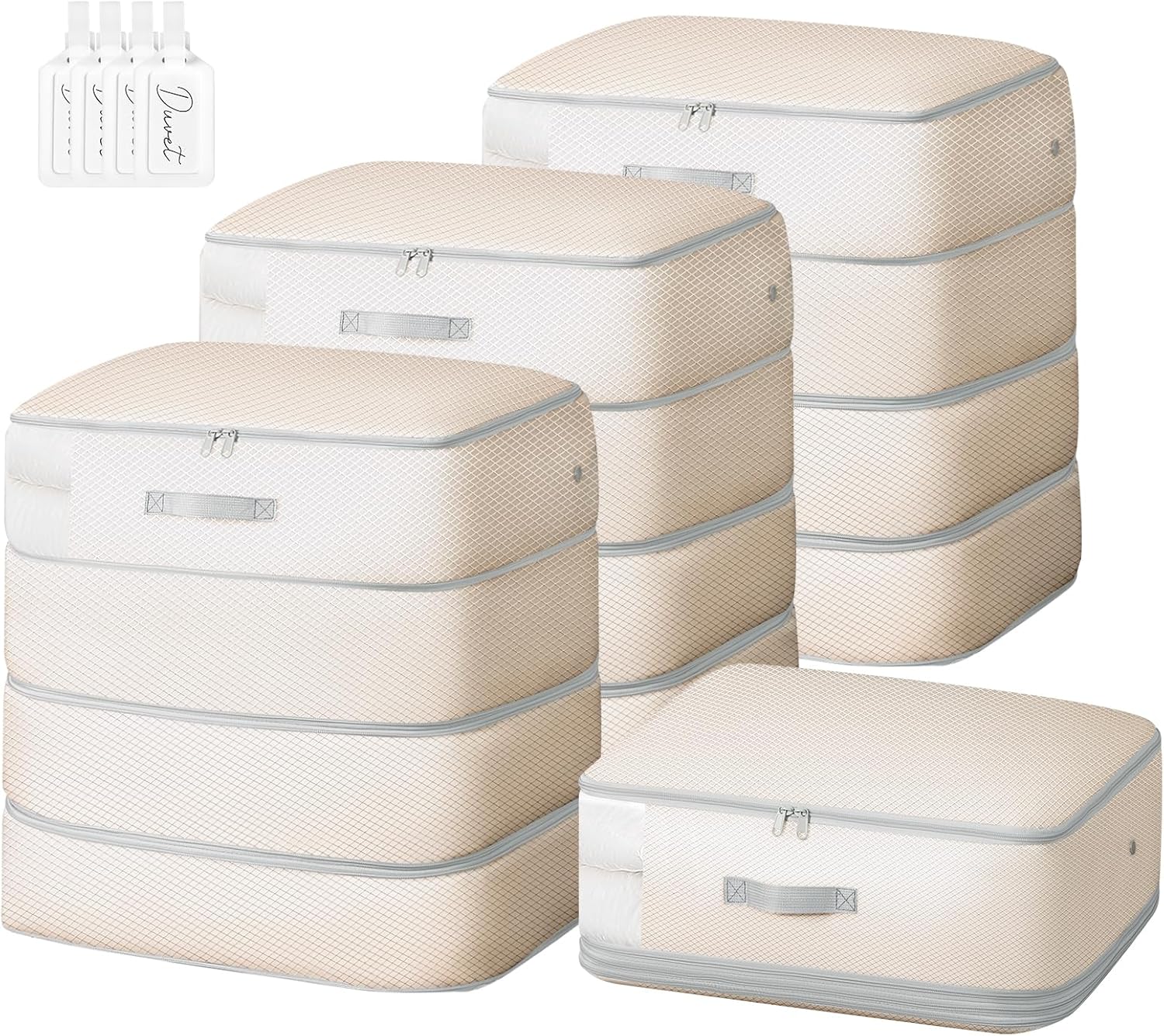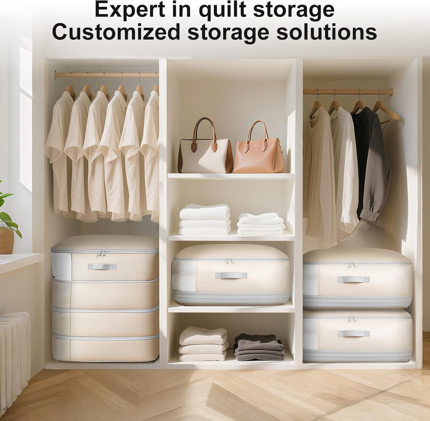 Comforter Storage Bag - 130L Large Capacity Blanket Storage Bags 4-Layer Ultra Space Saving Self Compression Organizer, Washable Compression Bags for Storage Comforter Blanket, 4-Pack, Beige