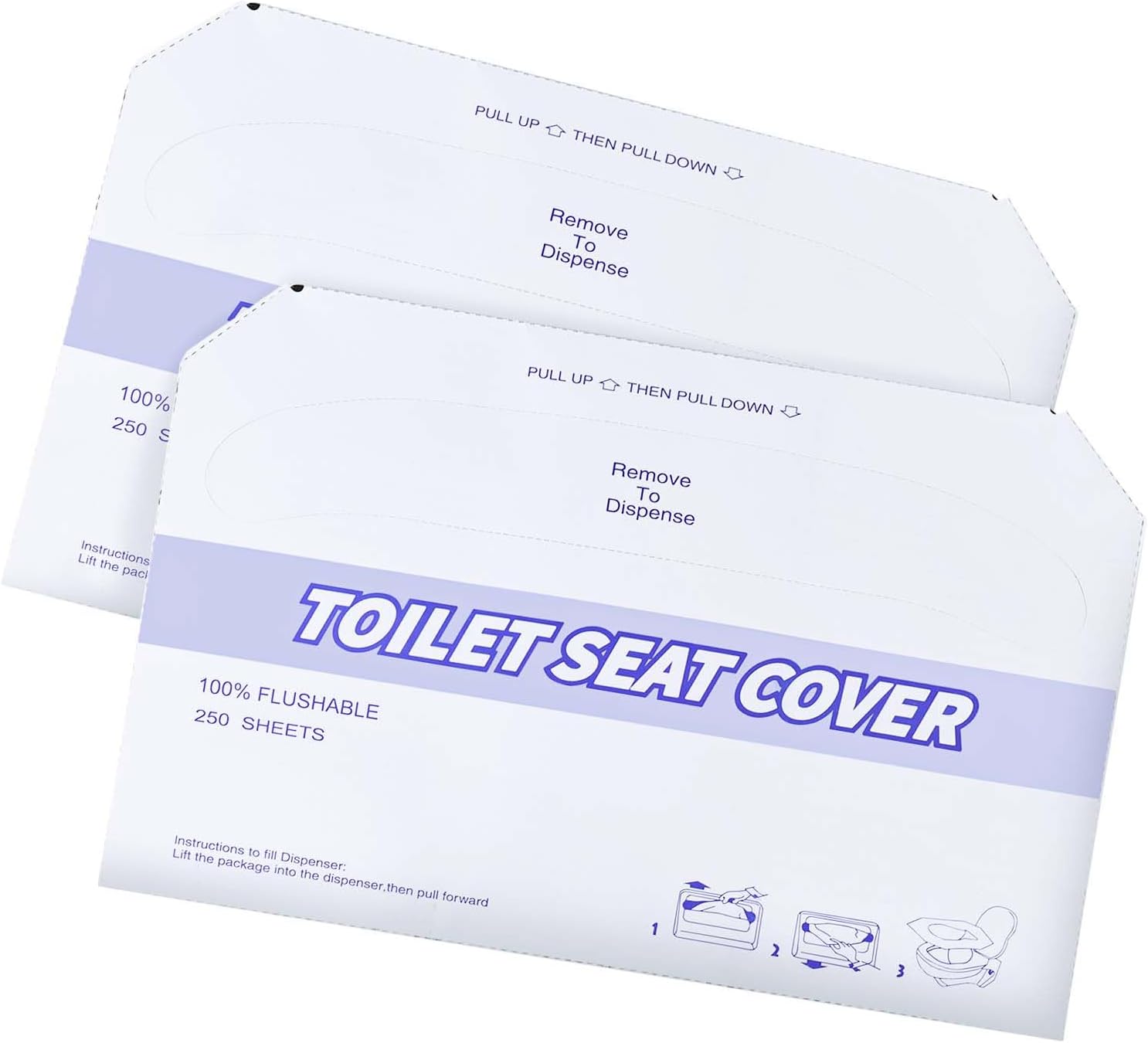 - You will receive 2 packs of disposable paper toilet seat protectors covers, 250 per pack (500 sheets total). Sufficient quantity suitable for public restrooms in hotels, restaurants, etc.