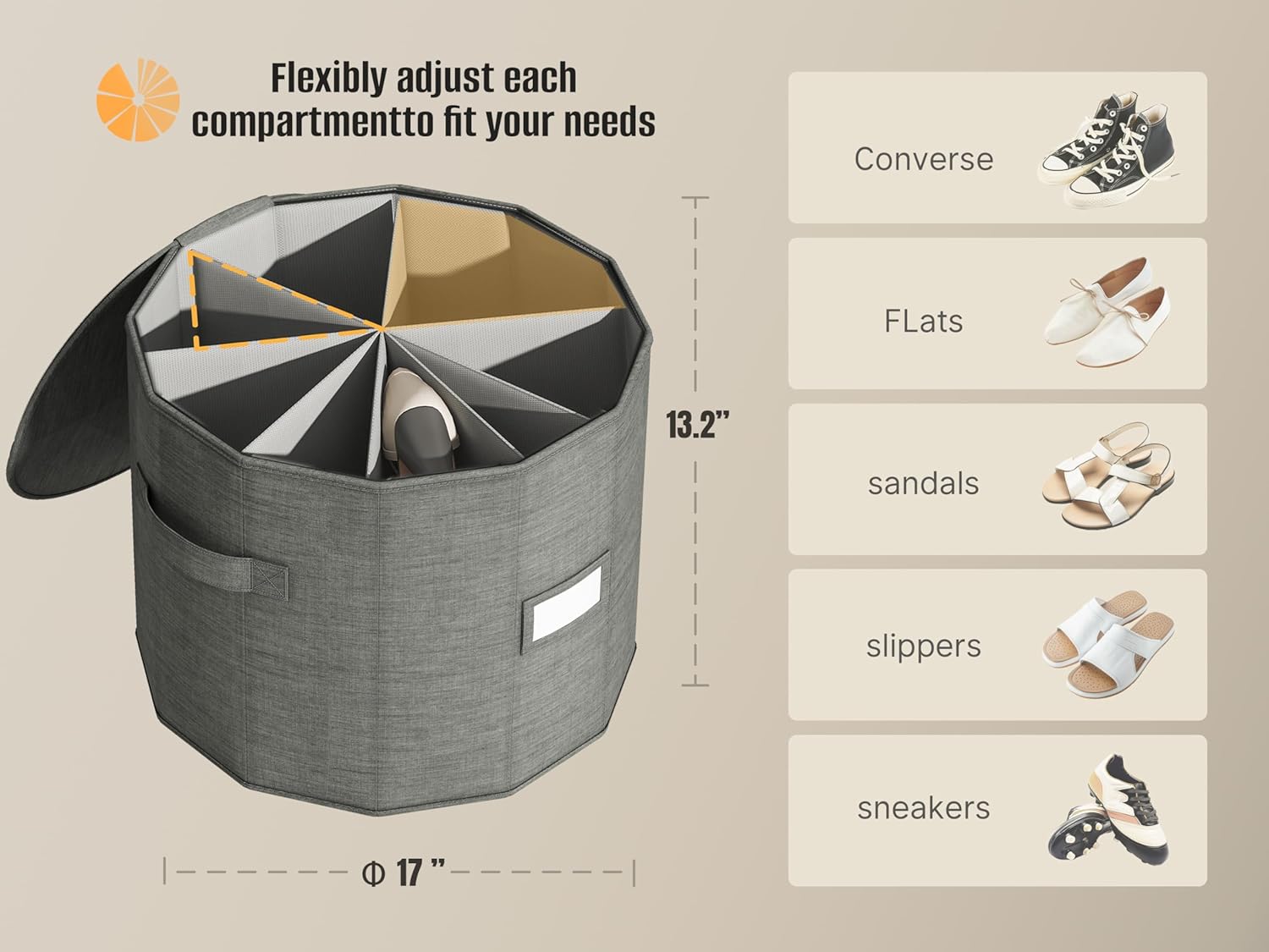 - 【Customizable Compartments】Features 8 adjustable dividers that pivot around a central axis, offering flexible storage solutions that can be tailored to accommodate everything from low-top sneakers to high-top boots. It can accommodate at least 12 pairs of flats, and when the dividers are fully extended to 180 degrees, it can hold at least 3 pairs of knee-high boots.