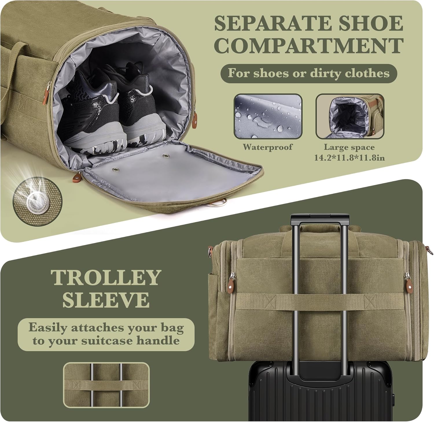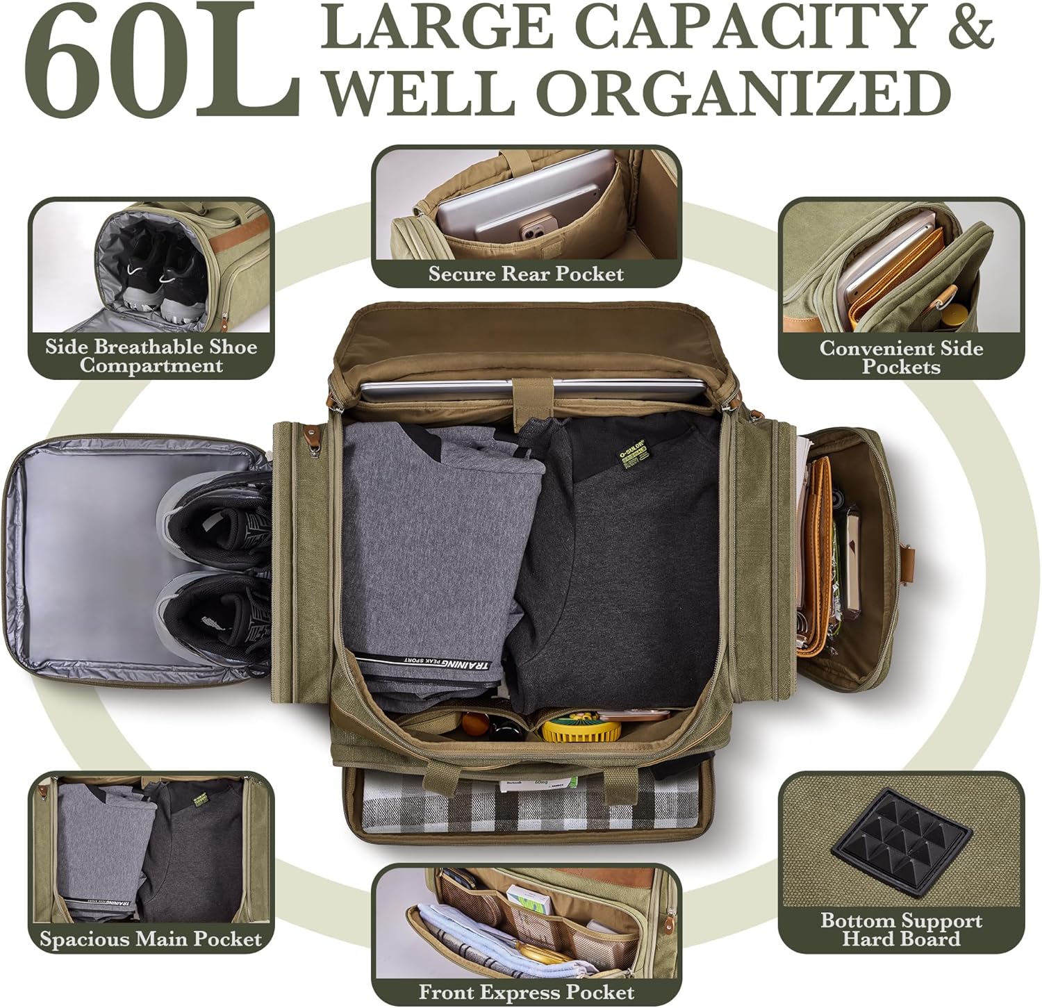 SHOWKOO Duffle Bag for Travel 60L Expandable Canvas Travel Bag Durable Vintage Weekender Overnight Carry On Bag for Men(Army Green)
