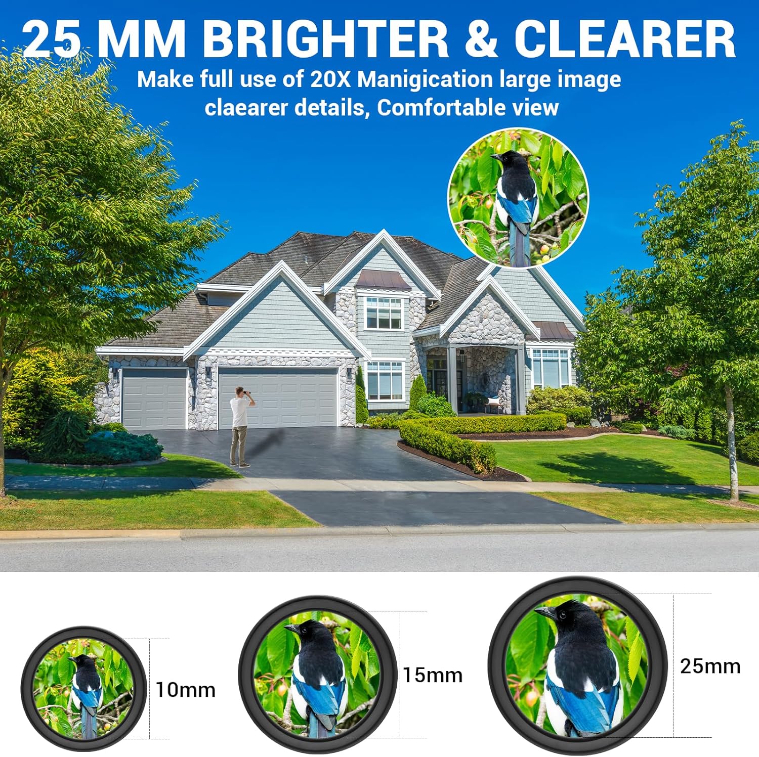 - 【HIGH-POWERED LARGE EYEPIECE BINOCULARS】 This binoculars has 20x magnification, 25mm objective lens and wide field of view, letting you look farther and see wider. Coating with FMC Broadband coating and premium BAK4 prism, it ensure imaging verisimilar.