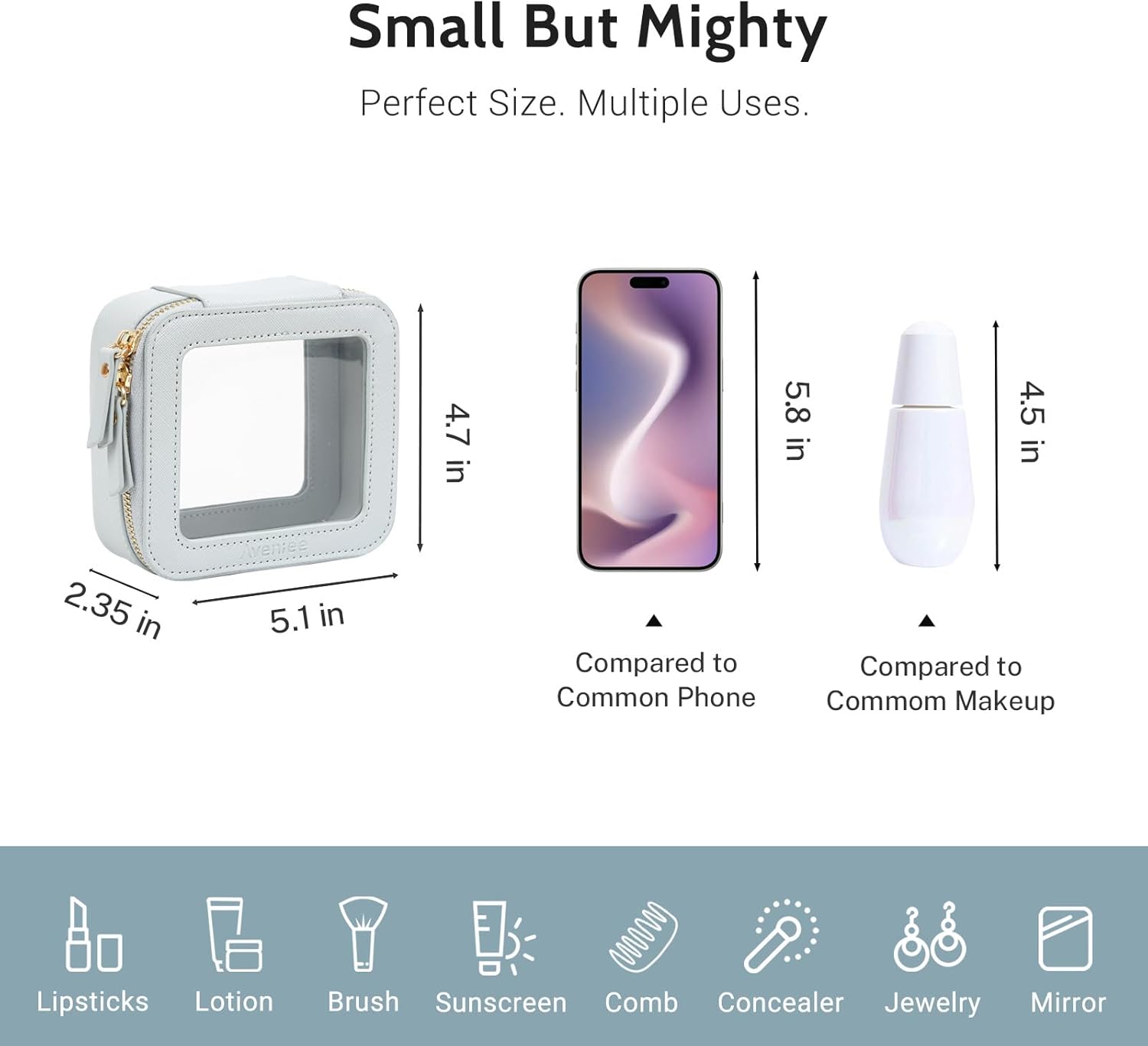- ❤【CAR MUST HAVE ESSENTIALS】This small cosmetic case can hold your daily essentials, such as foundation, hand cream, eye shadow, lipstick, short makeup brush, hair ties, small mirror, small comb, etc. This clear mini toiletry bag can be a good car accessory fits in the glove compartment or the center console of your beloved car.