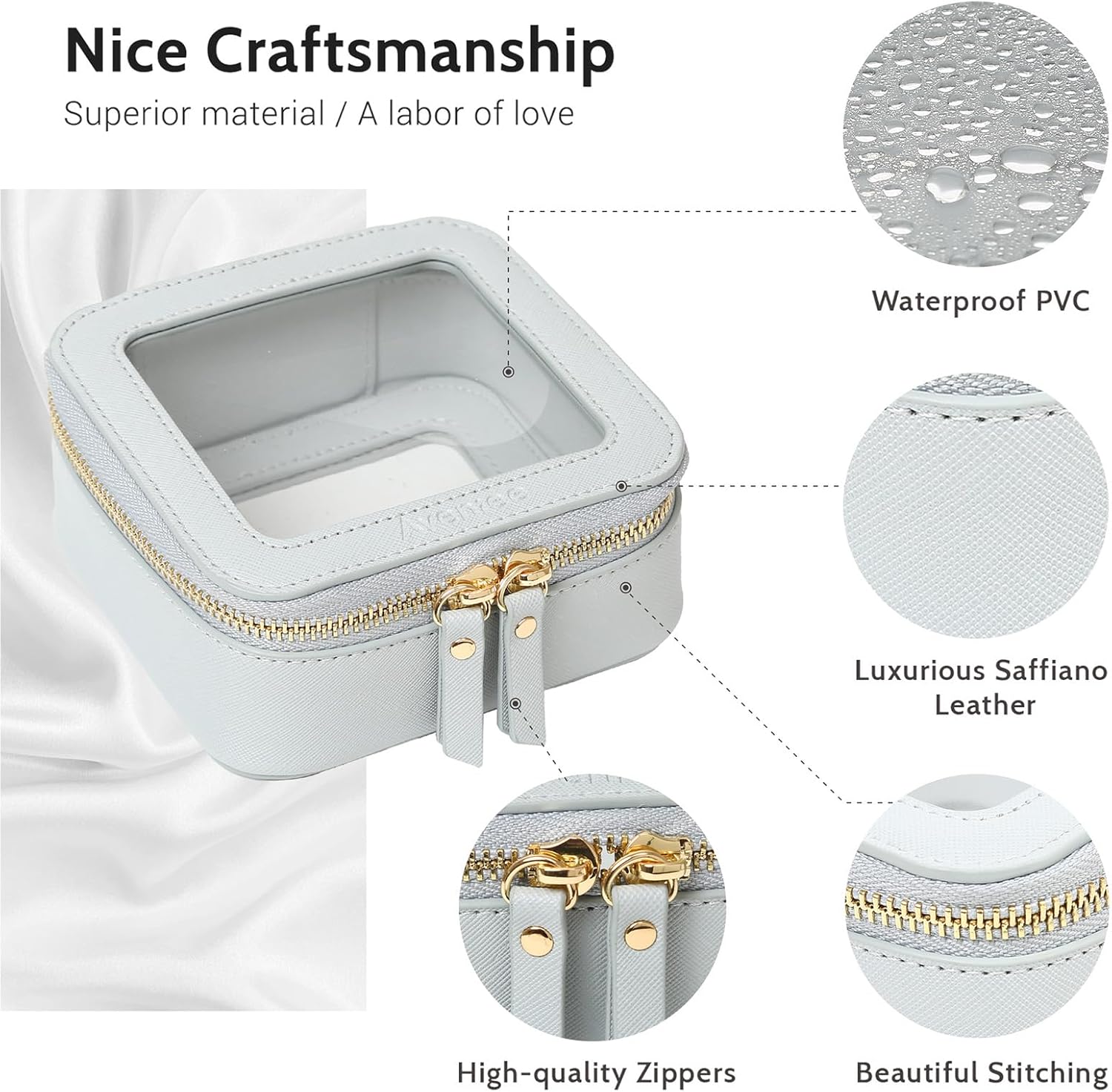 - ❤【LUXURY DESIGN】Unlike other flimsy clear makeup bags, our mini cosmetic case(measuring 5.1’ x 4.8’ x 2.35’) which made of premium saffiano PU leather and thick vinyl can keep a good structure and. The small cosmetic bag was designed into a minimalist boxy shape, crafted in beautiful PU leather and finished with polished hardware. Together with the beautiful stitches and whisper-quiet metal zippers, it’s durable for long-lasting use.