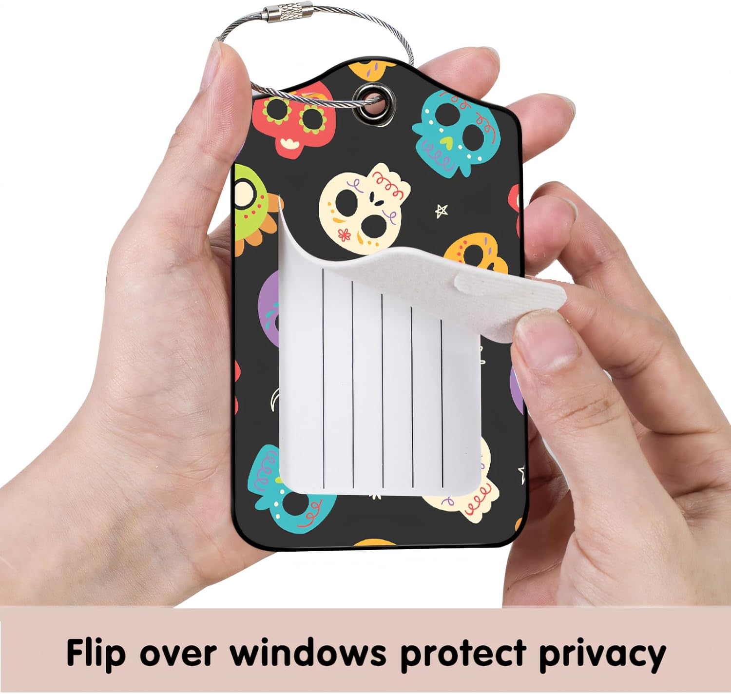 Luggage Tags for Suitcases, 2-Pack PU Leather for Cruise & Travel, Baggage ID Tags with Privacy Cover & Address Card, Durable Metal Ring, Kids Adults Travel Accessories, Sugar Skulls
