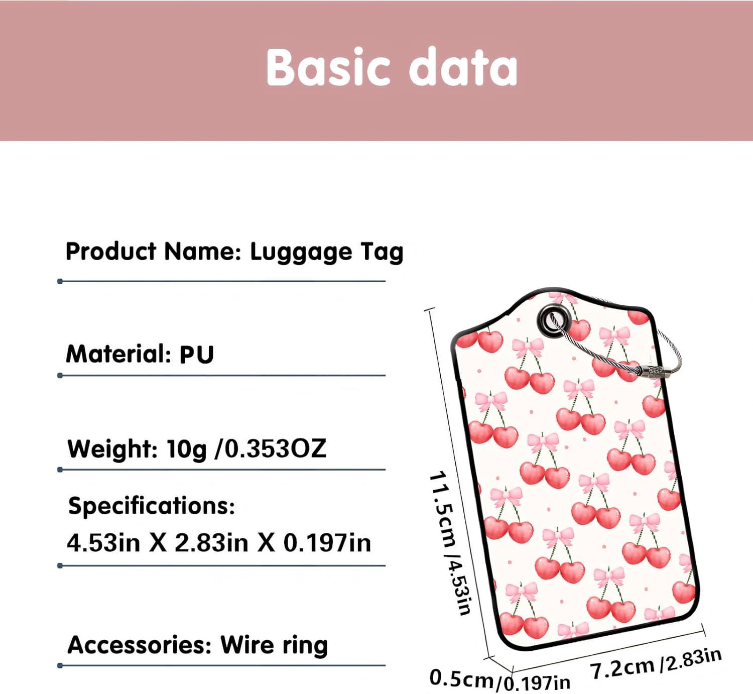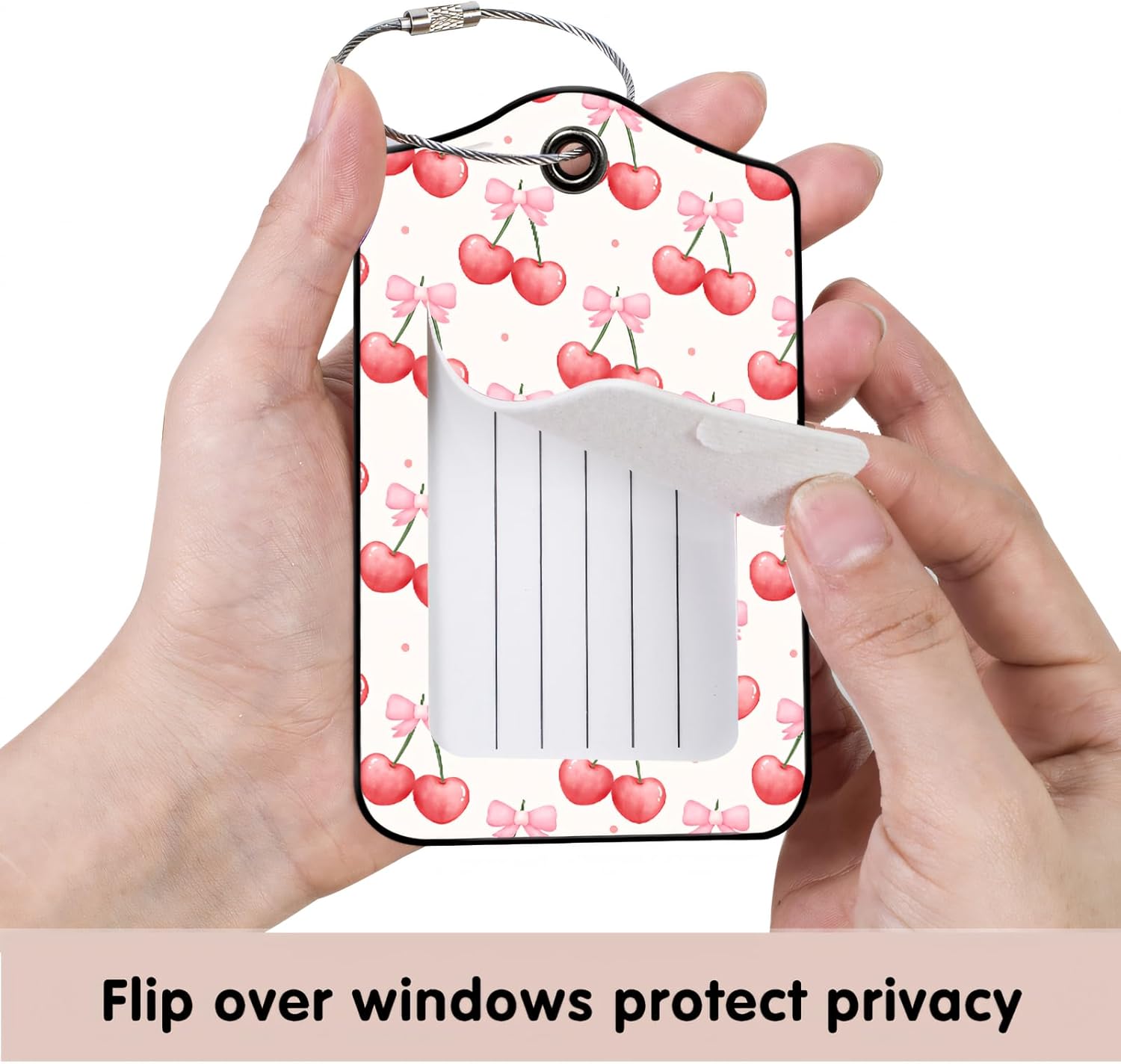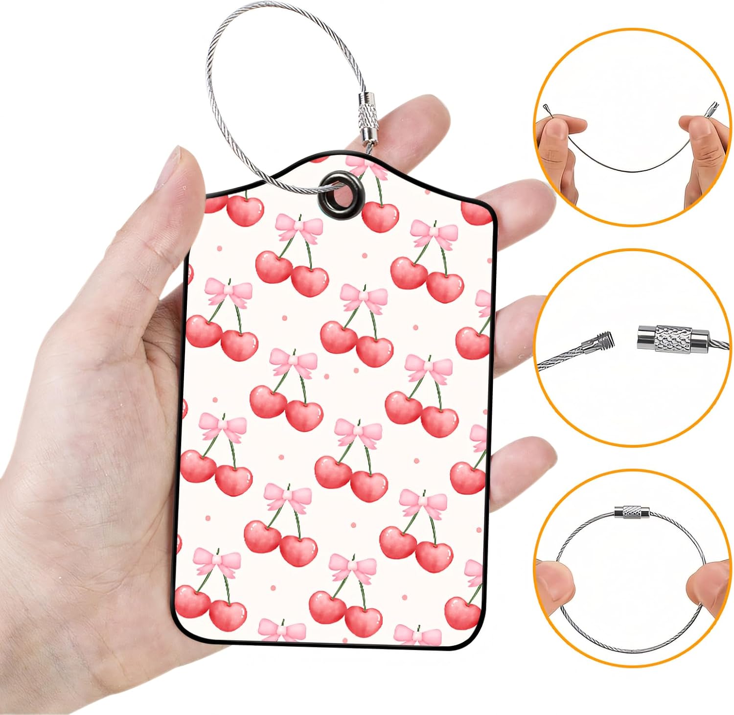 Luggage Tags for Suitcases, 2-Pack PU Leather for Cruise & Travel, Baggage ID Tags with Privacy Cover & Address Card, Durable Metal Ring, Kids Adults Travel Accessories, Sweet Bow Cherries