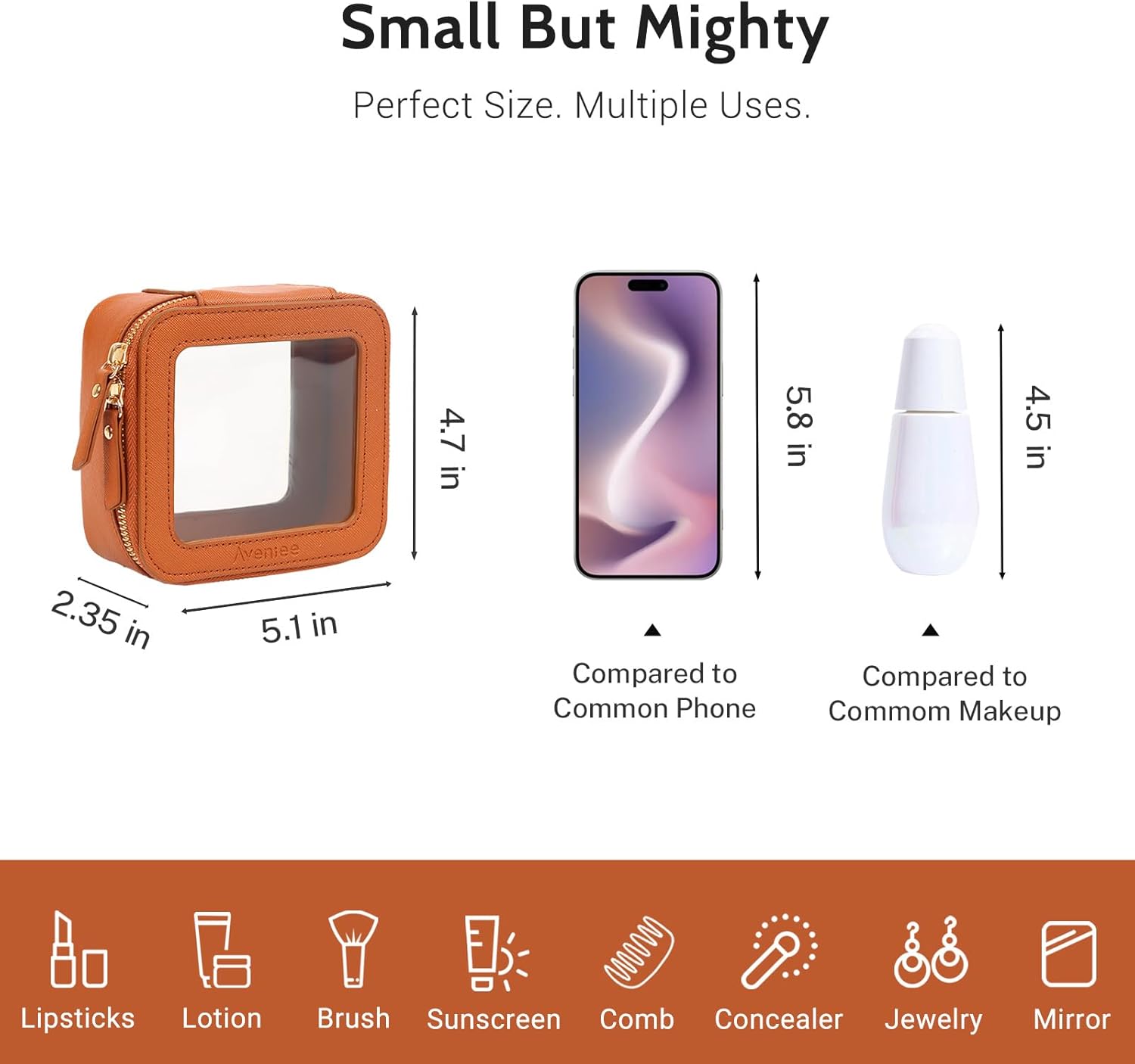 - ❤【CAR MUST HAVE ESSENTIALS】This small cosmetic case can hold your daily essentials, such as foundation, hand cream, eye shadow, lipstick, short makeup brush, hair ties, small mirror, small comb, etc. This clear mini toiletry bag can be a good car accessory fits in the glove compartment or the center console of your beloved car.