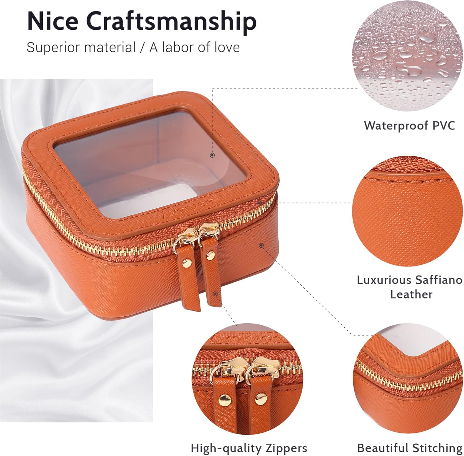 - ❤【LUXURY DESIGN】Unlike other flimsy clear makeup bags, our mini cosmetic case(measuring 5.1’ x 4.8’ x 2.35’) which made of premium saffiano PU leather and thick vinyl can keep a good structure and. The small cosmetic bag was designed into a minimalist boxy shape, crafted in beautiful PU leather and finished with polished hardware. Together with the beautiful stitches and whisper-quiet metal zippers, it’s durable for long-lasting use.