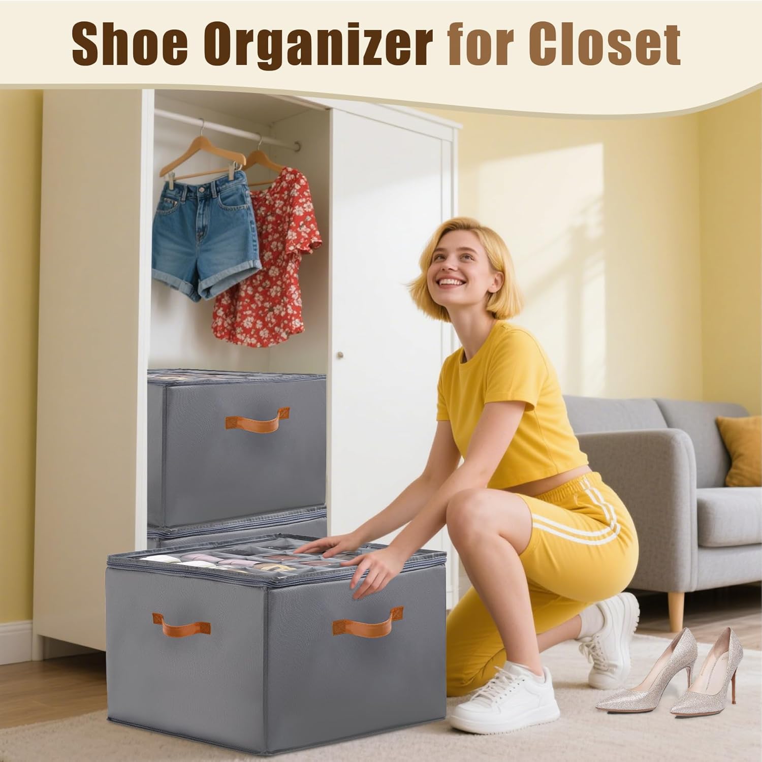 Shoe Organizer for Closet, Fits up to 16 Pairs Shoe Storage, Clear Foldable Shoe Containers Boxes Bins Baskets with Adjustable Dividers and Clear Cover Grey