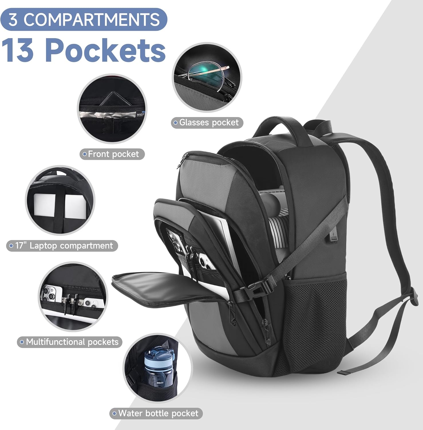 - 【Spacious & Organized–30L Large Capacity】Designed for professionals and travelers, our 30L work backpack offers 3 large compartments and 13 pockets for efficient storage. The main compartment and hidden pockets securely store your 17" laptop, textbooks, office supplies, travel accessories, clothes, sunglasses, and Kindle. Side mesh pockets keep water bottles or umbrellas easily accessible, and keep everything neatly organized for outdoor hiking, business, college, or travel needs
