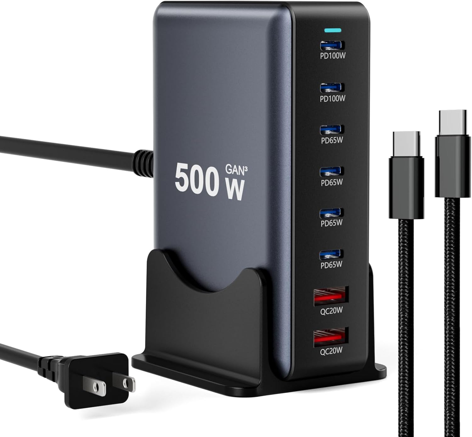 500W Fast Charging 8 Port USB C Charger Block with Nylon Fast Charging Cable, Multi-Device Charging Station Wall Desktop Charger with GaN Ⅲ Technology, USB-C Charger Adapter for MacBook/iPad/iPhone 16