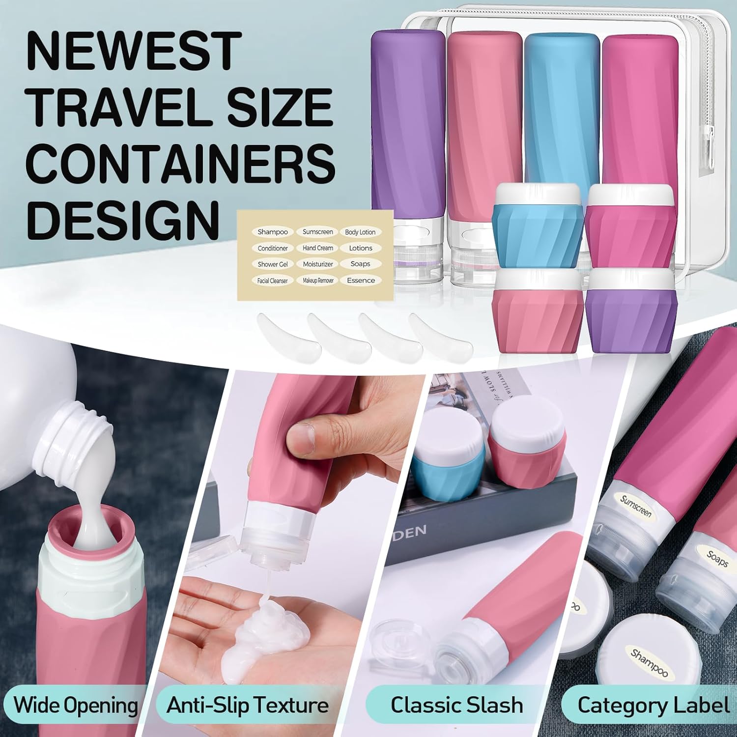 - 【14PCS Travel Toiletries Containers】This Travel Set includes 4 silicone travel bottles, 4 silicone travel jars, 4 spoons, 1 printed label, and 1 clear zipper bag. It offers different accessories for your needs