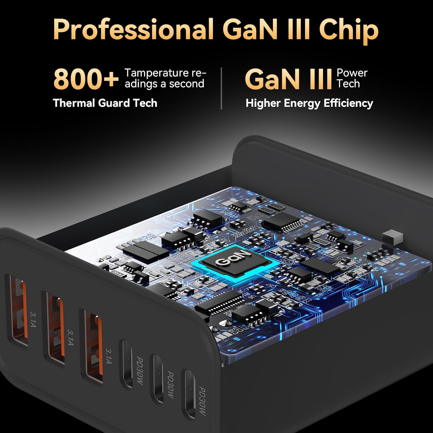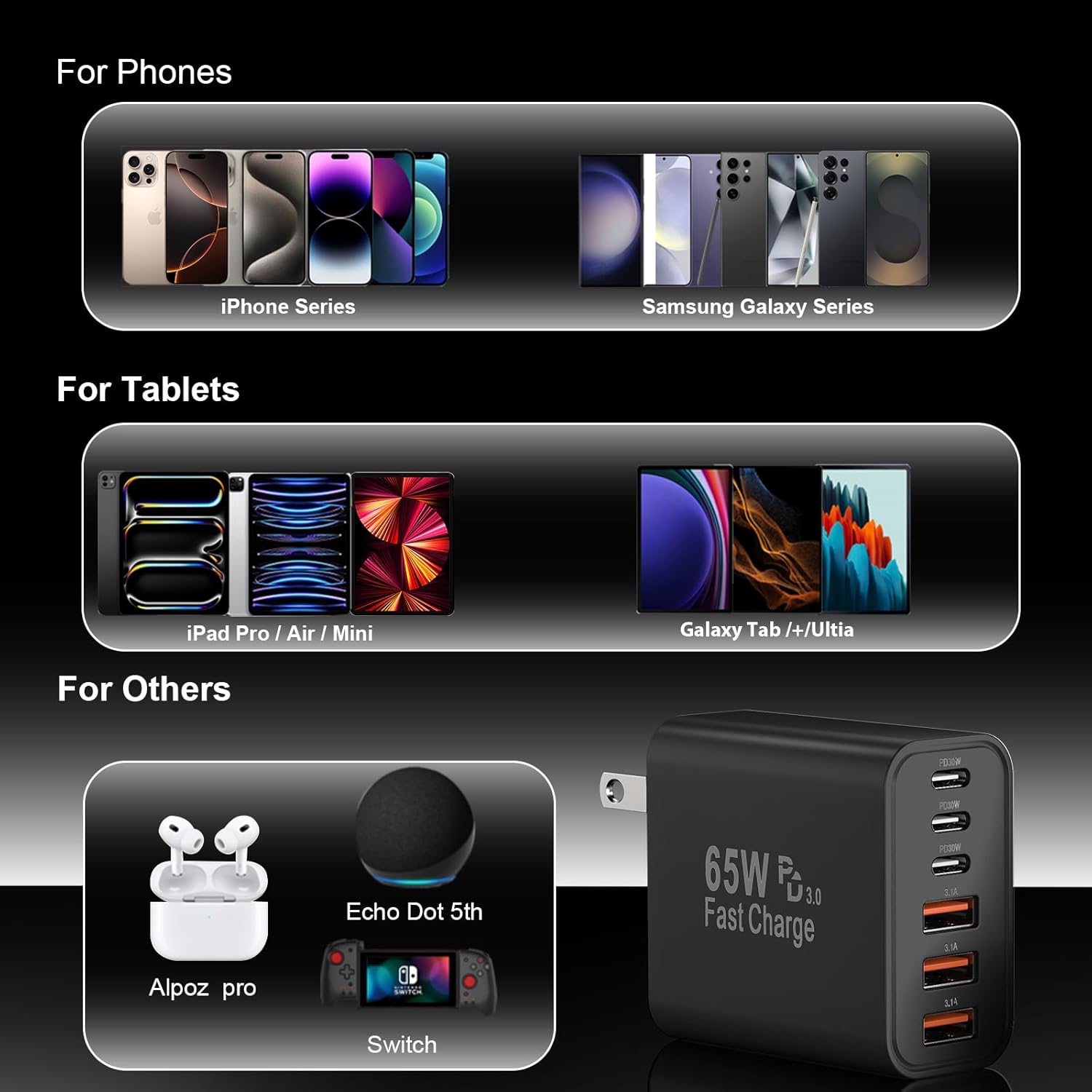 - USB Multiport Charger Block -- A 6 IN 1 Upgraded USB C Power Block with triple USB-C ports and triple USB-A ports. It allows users to charge up to 6 devices simultaneously, while its incredibly compact size and high efficiency minimize waiting time. This design lets users conveniently charge phones, tablets, cameras, power banks, and various devices all at once, Ideal for home, office and on the go.