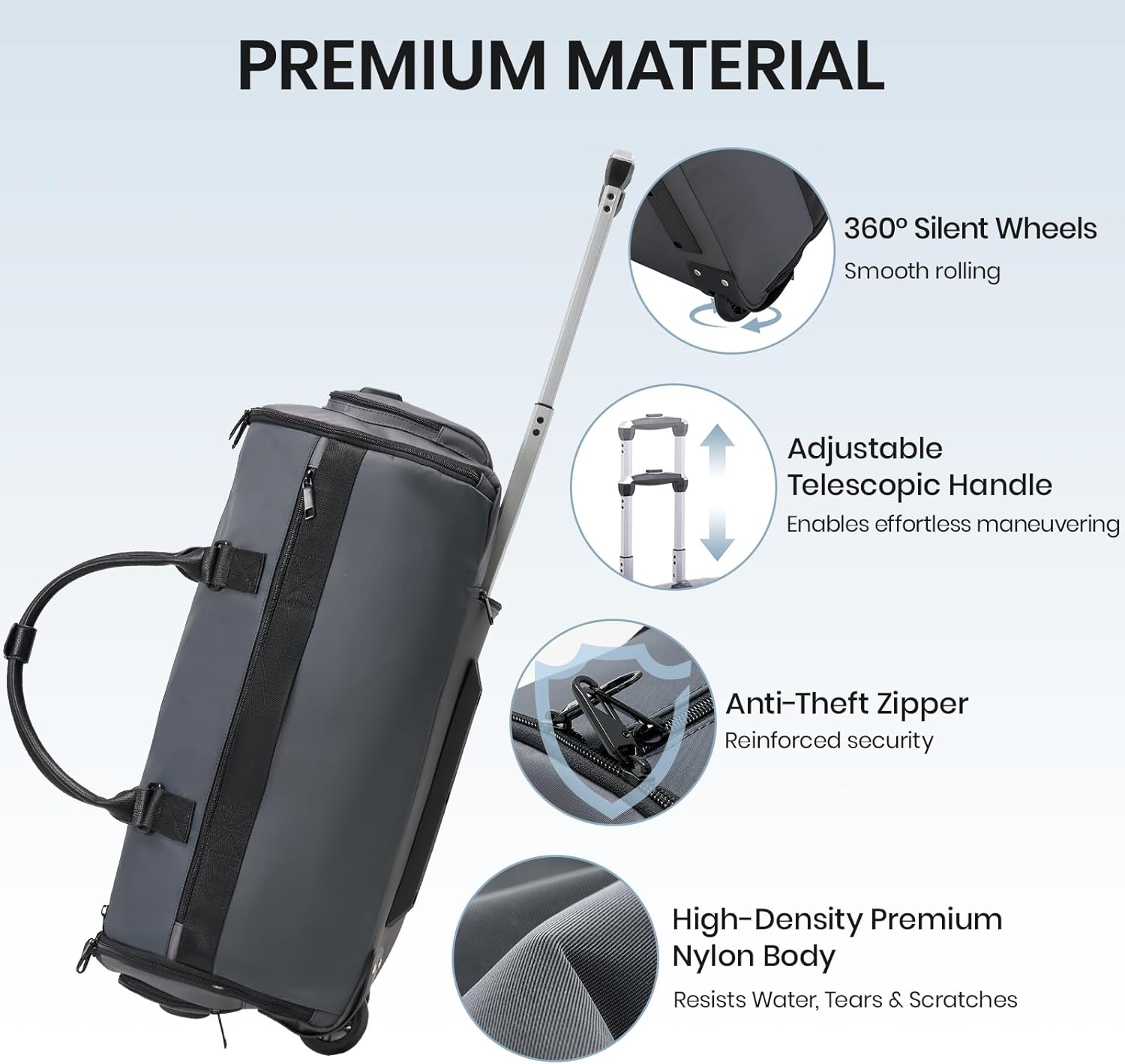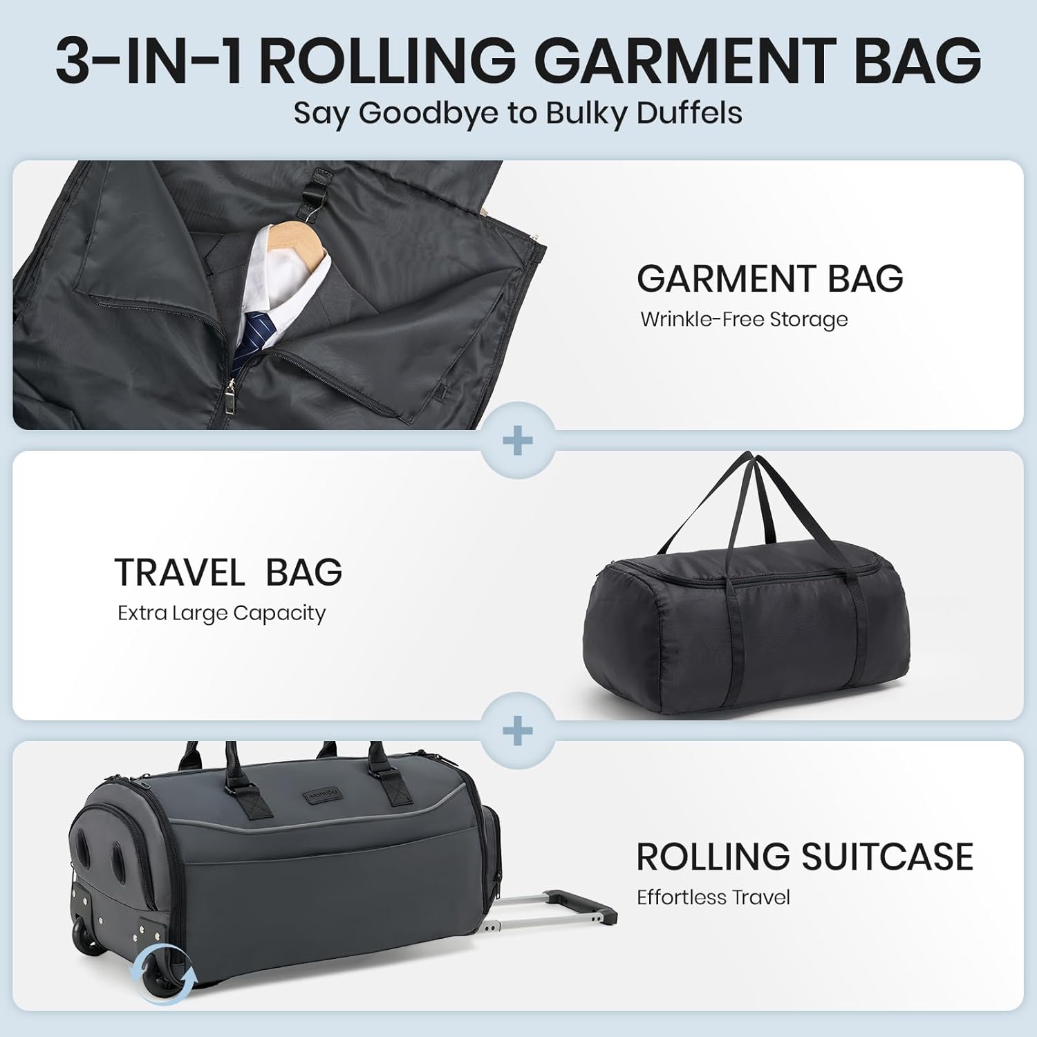 - 【SAY GOODBYE TO BULKY DUFFELS! 】The Fanwoli 3-in-1 Rolling Garment Bag merges a garment bag, travel bag, and wheeled trolley. It keeps suits wrinkle-free like traditional garment bags but adds high-capacity storage and smooth-rolling wheels for effortless travel. Perfect for business trips, travel , weddings, or weekends—all your travel needs solved in one sleek bag!