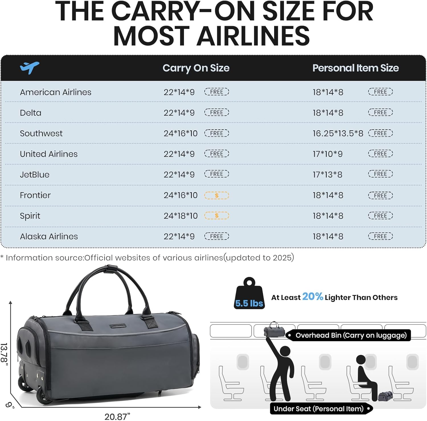 - 【QUALITY MATERIALS】Fanwoli garment bag with wheels is made of high-density premium nylon material with triple protection against splash, tear and scratch. Featuring explosion-proof locking zippers and durable 360° silent wheels (tested on common floors such as concrete, carpet, gravel, etc.). With an extra-large 20.87” x 13.78” x 9.06” capacity yet weighing just 5.51 lbs (20% lighter than others), it meets most airline carry-on standards—making travel effortless and stress-free.